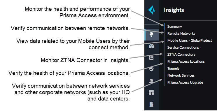angle. Drill down for details on specific users, sites, connections, or Prisma Access infrastructure components.