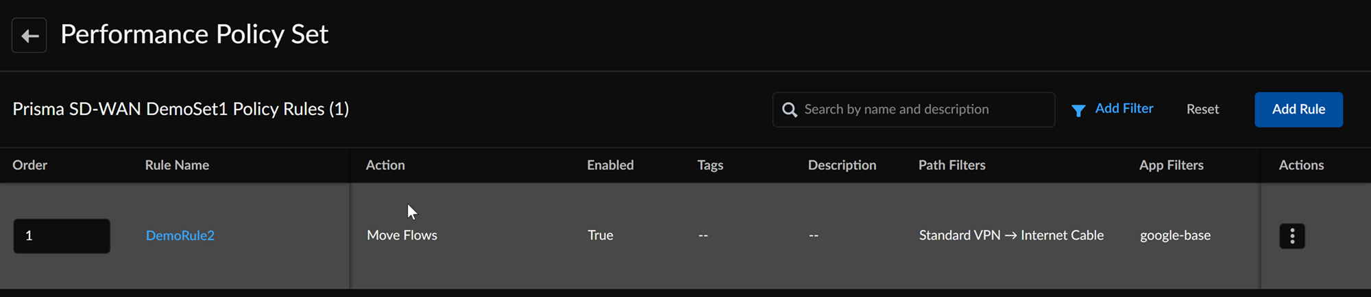 - Go to ConfigurationPrisma SD-WANPoliciesPerformancePerformance Sets.Select a Policy SetAdd Rule.