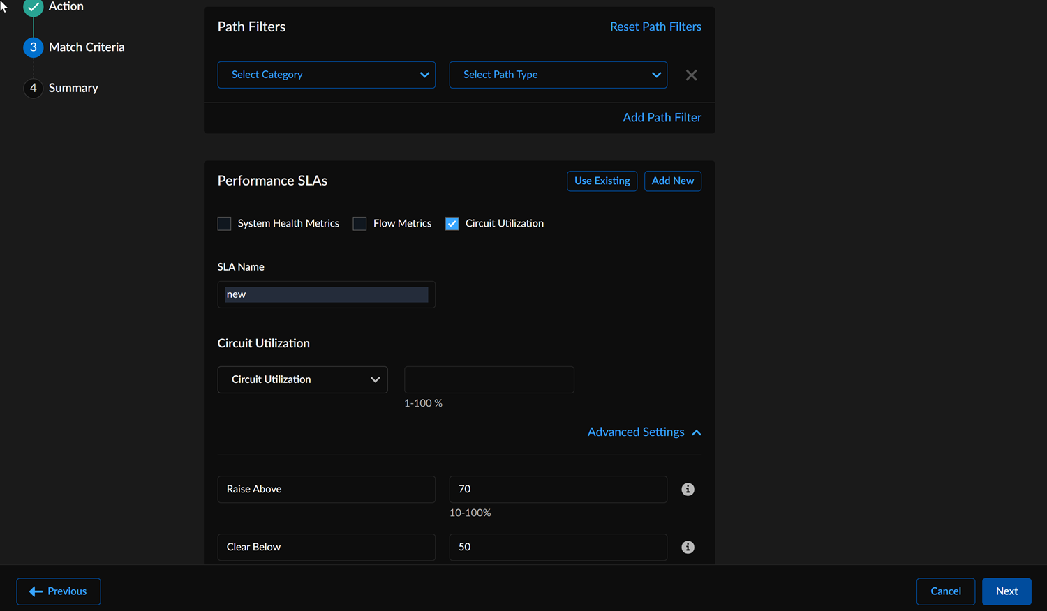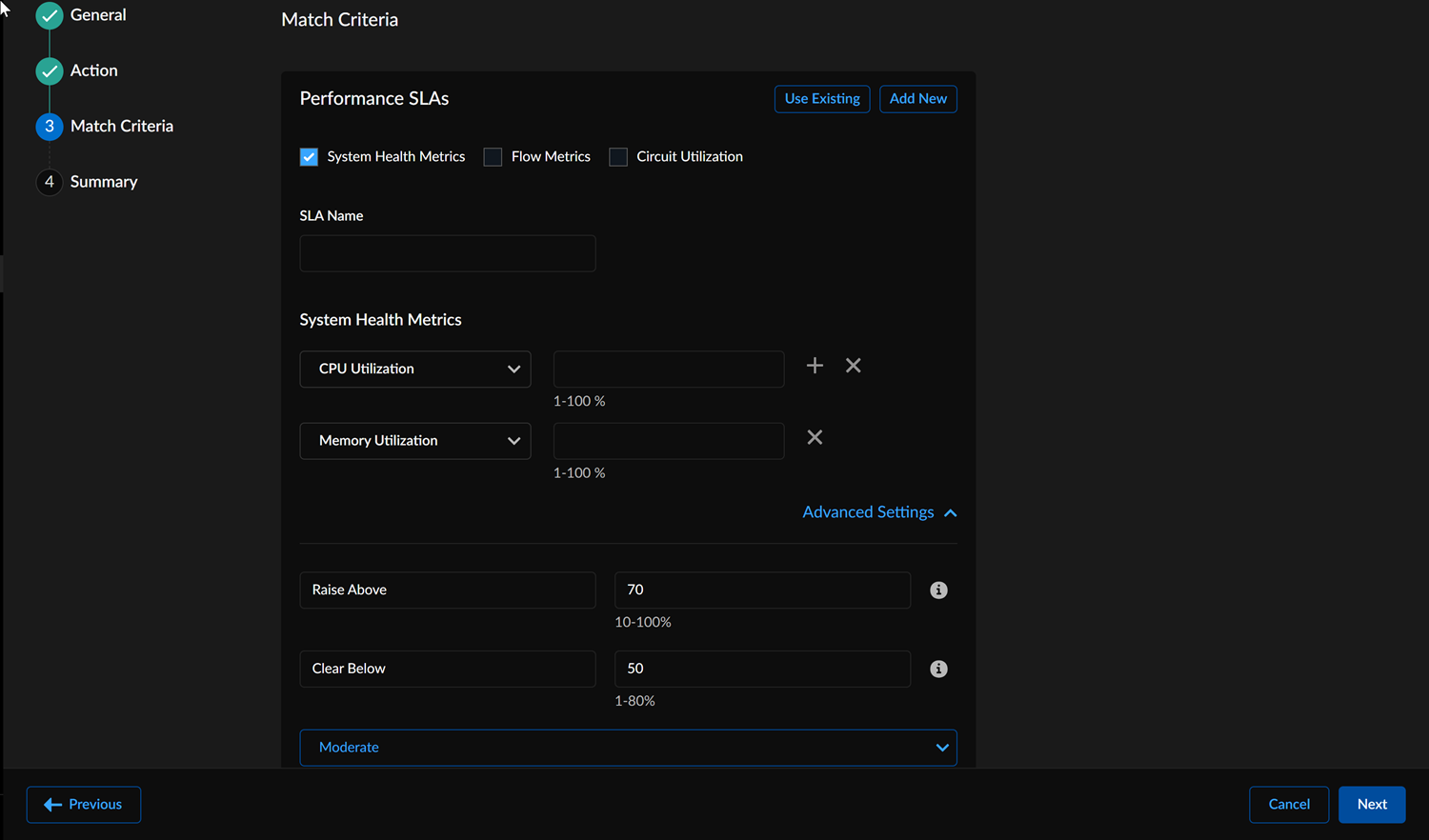 Incidents are generated for system health metrics using Concurrent Flows, Memory, CPU, Disk, and Circuit Utilization SLA criteria. - In the Performance SLAs section, you can either use an existing performance threshold, or to add a new threshold, click Add New. Check any or all of the metrics.