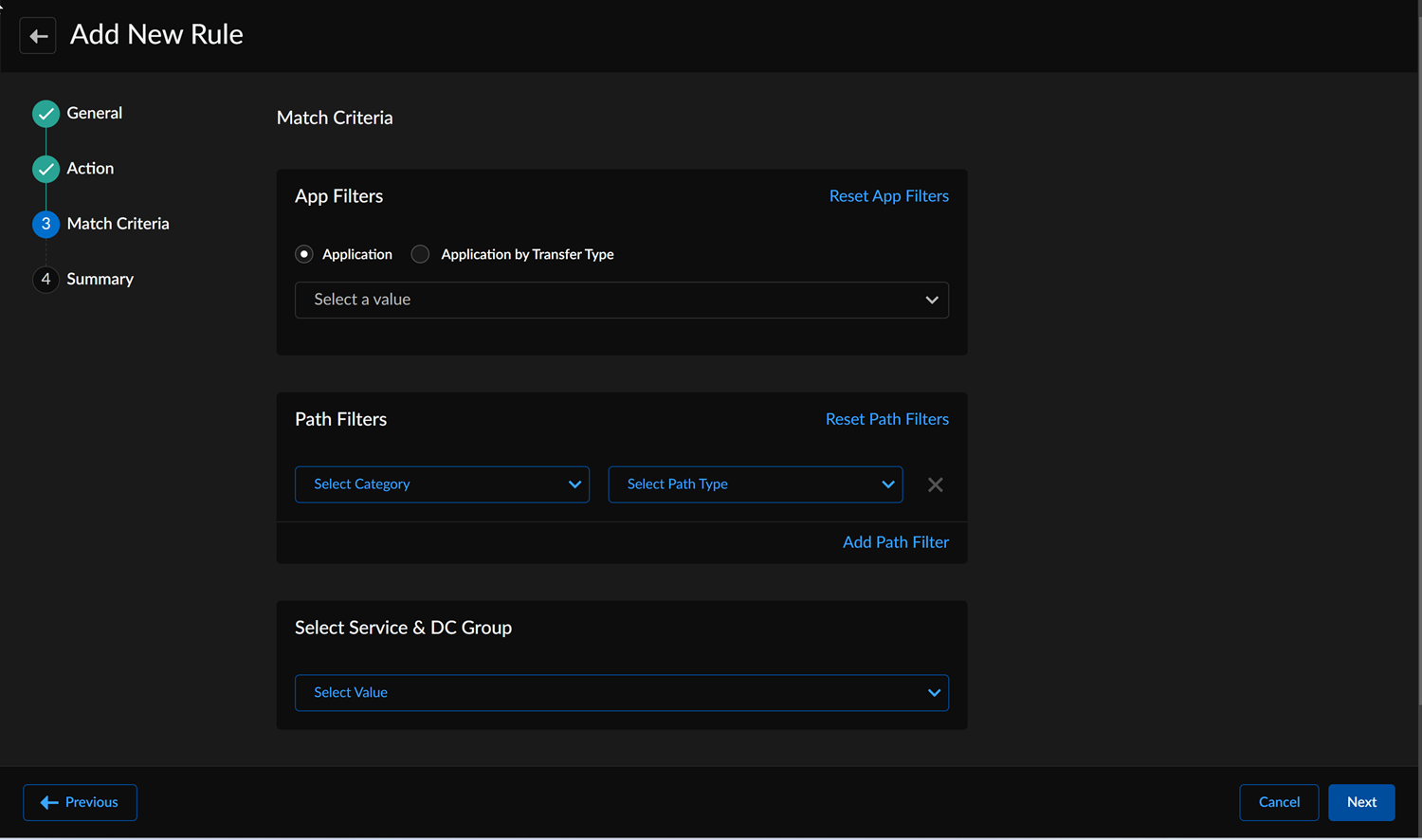 - (Optional) In Path Filters, select the Path Category from the drop-down. Select an overlay and a Circuit Category for a path. You can't repeat a combination of an overlay and a circuit category for a policy rule.