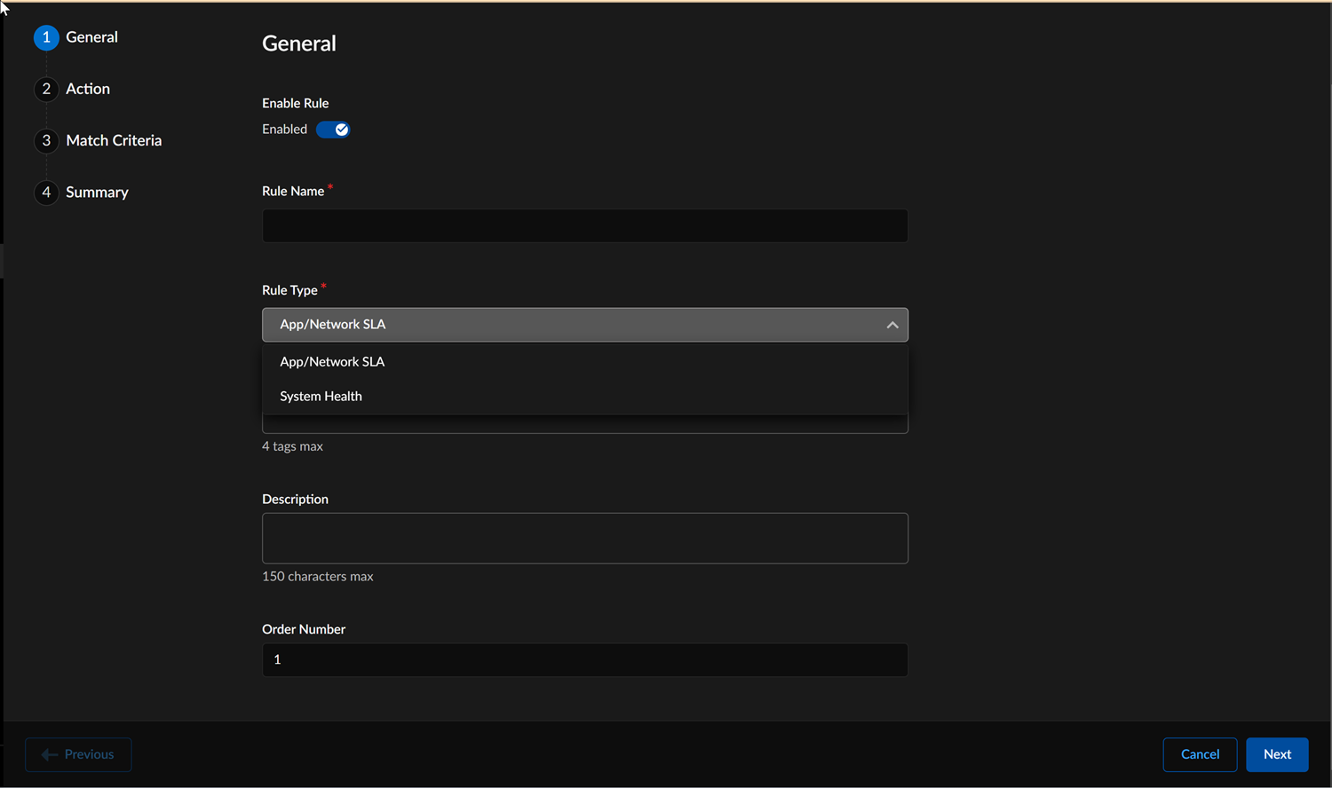 x`Enter an Order Number for the policy rule. An order of 1 will place the rule at the top of the list.Organize specific rules at the top of the Policy Set list; otherwise, a less specific policy rule may be matched first.Performance Policy rules follow explicit ordering, wherein each rule within a policy set has an order number that is used, a set of match criteria, and a set of actions.The default order number will place the rule at the bottom of the policy set, just above the default rules. Rules will automatically reorder if a non-default rule order is specified.Select the Rule Type as App/Network SLA or System Health.App/Network SLA- If you select App/Network SLA as the