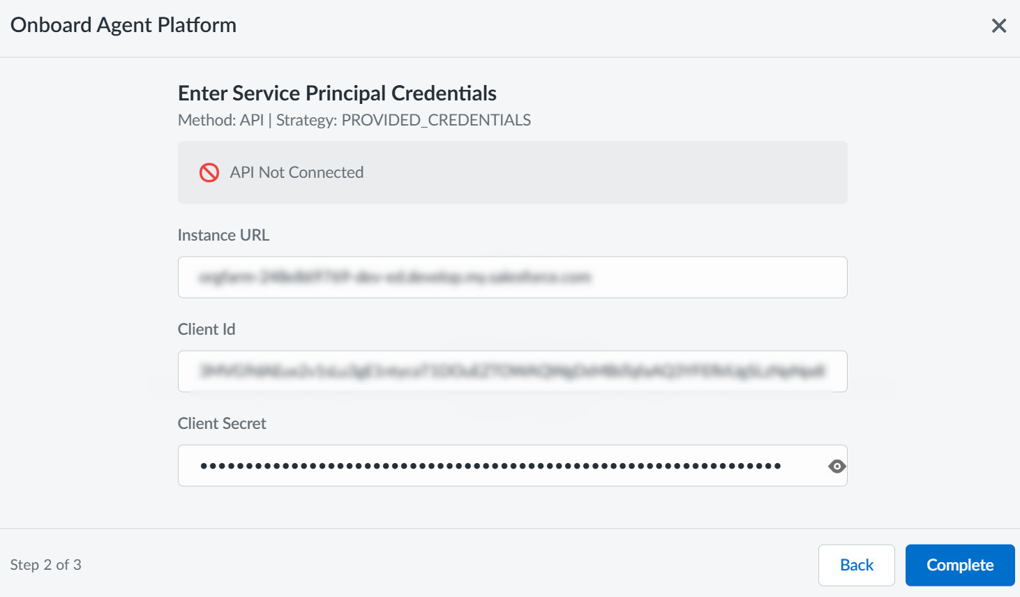 ,On the Enter Service Principal Credentials page, enter the following information and Complete.- Instance URL
