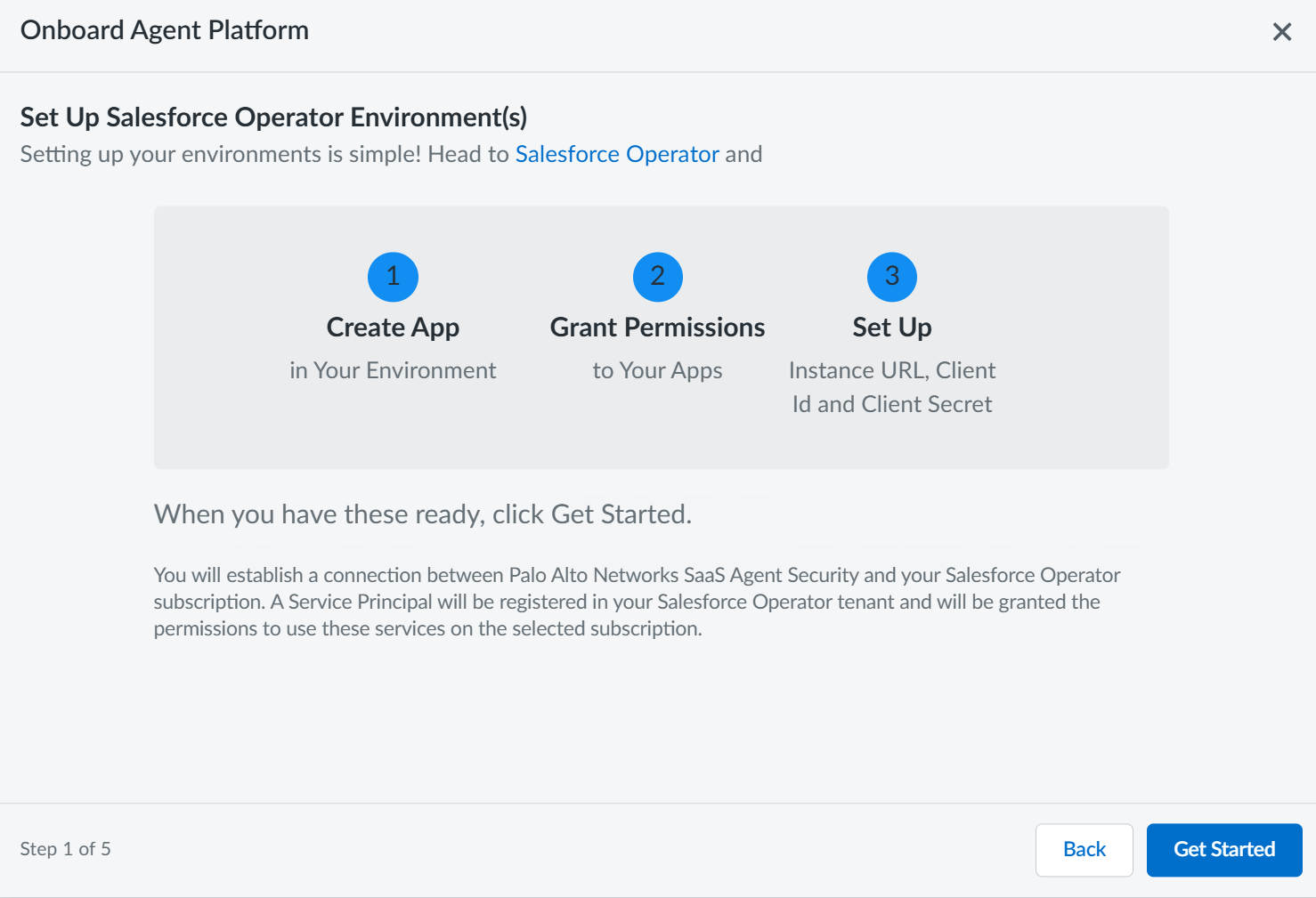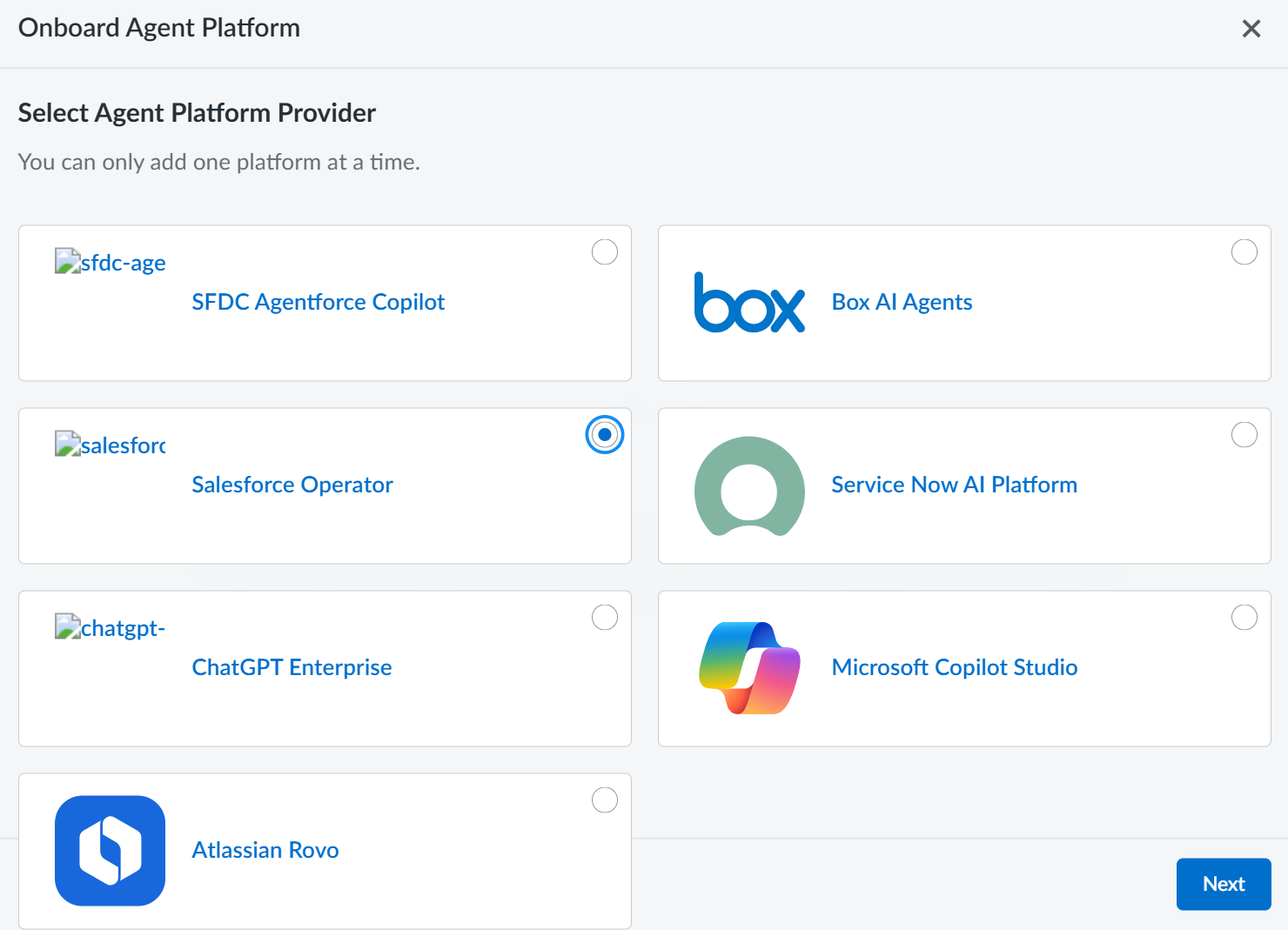 Onboard Salesforce Agentforce platform to SaaS Agent Security.- To start onboarding Salesforce Agentforce platform to SaaS Agent Security, log in to Strata Cloud Manager.Select Agent Platform OnboardingOnboard Agent PlatformSFDC Agentforce Copilot and click Next.