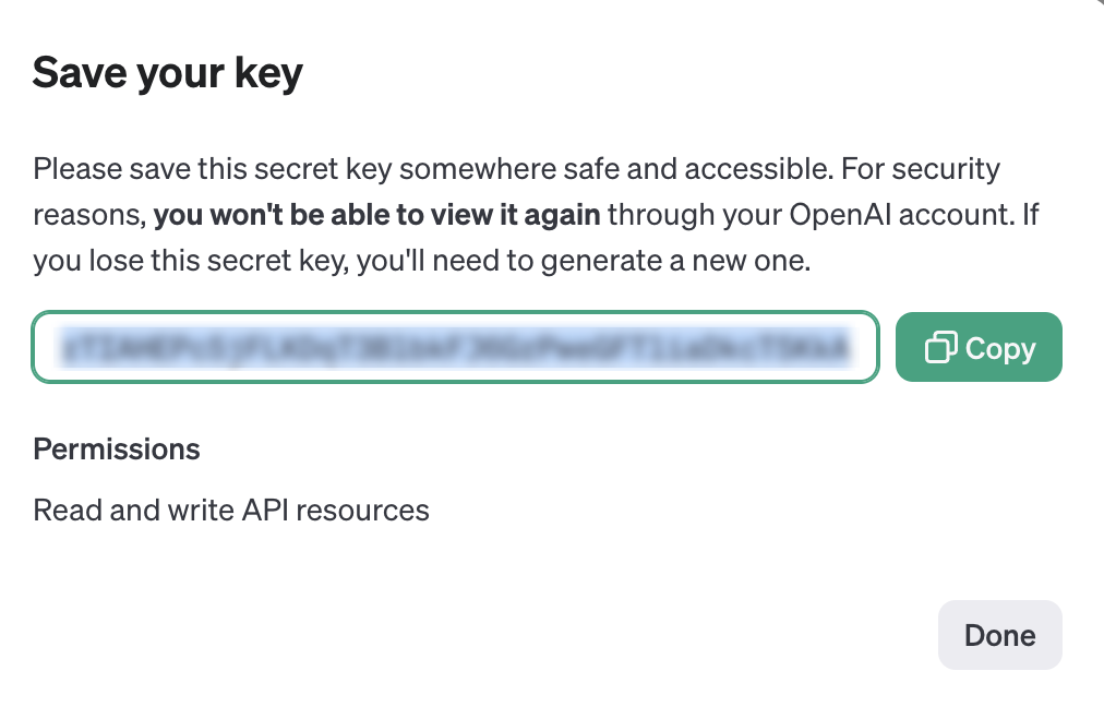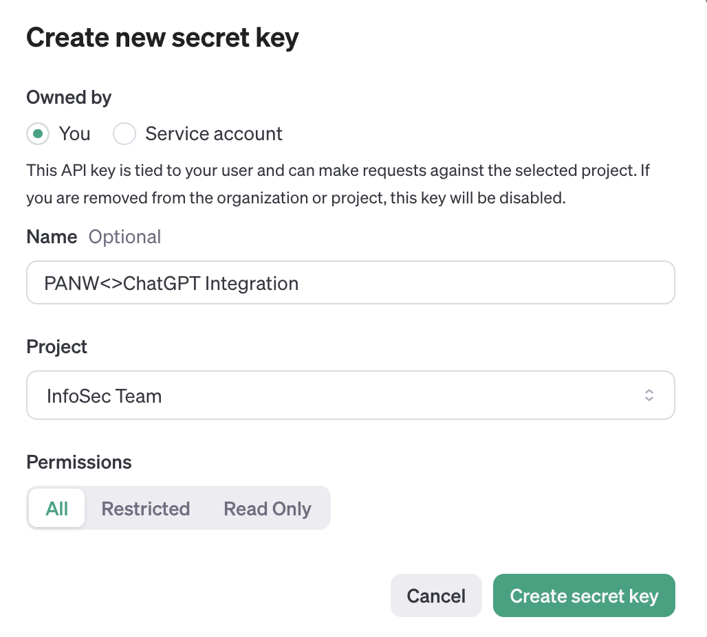 To fetch the Secret Key, go to the OpenAI API-Keys site and click + Create new secret key. In the Create new secret key page, enter the required details and Create secret key.- During key generation, ensure that the