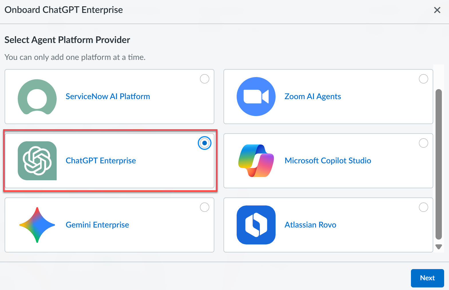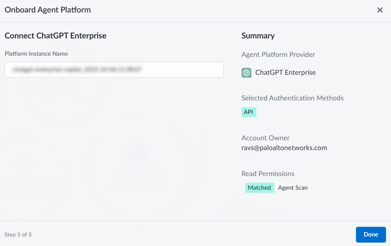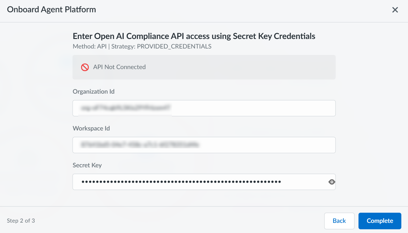 Further instructions are available in the ChatGPT API Reference.After Open AI enables the key for Compliance API, proceed to add the ChatGPT Enterprise connector to Data Security.To start onboarding ChatGPT Enterprise platform to SaaS Agent Security, log in to Strata Cloud Manager.Select InsightsSaaS AgentsAgent Platform OnboardingOnboard Agent PlatformChatGPT Enterprise.