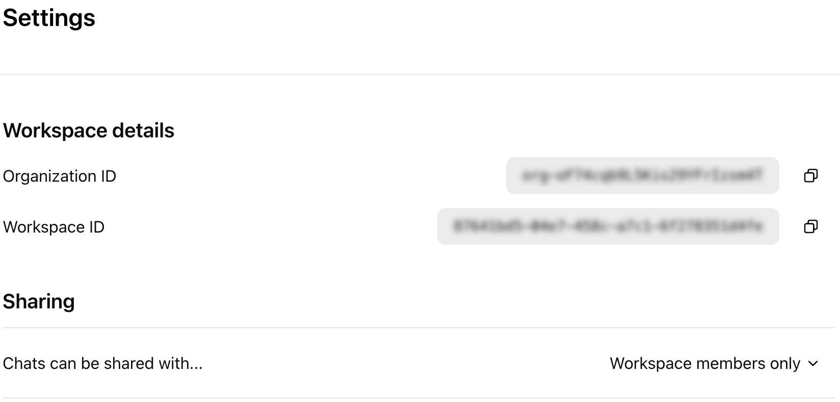 - Sign in to your ChatGPT Enterprise instance.Fetch the Organization ID and Workspace ID from ChatGPT Settings (select ChatGPTManage WorkspaceSettings) and keep them handy.