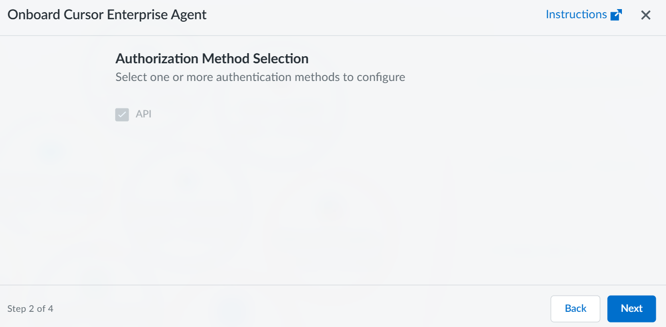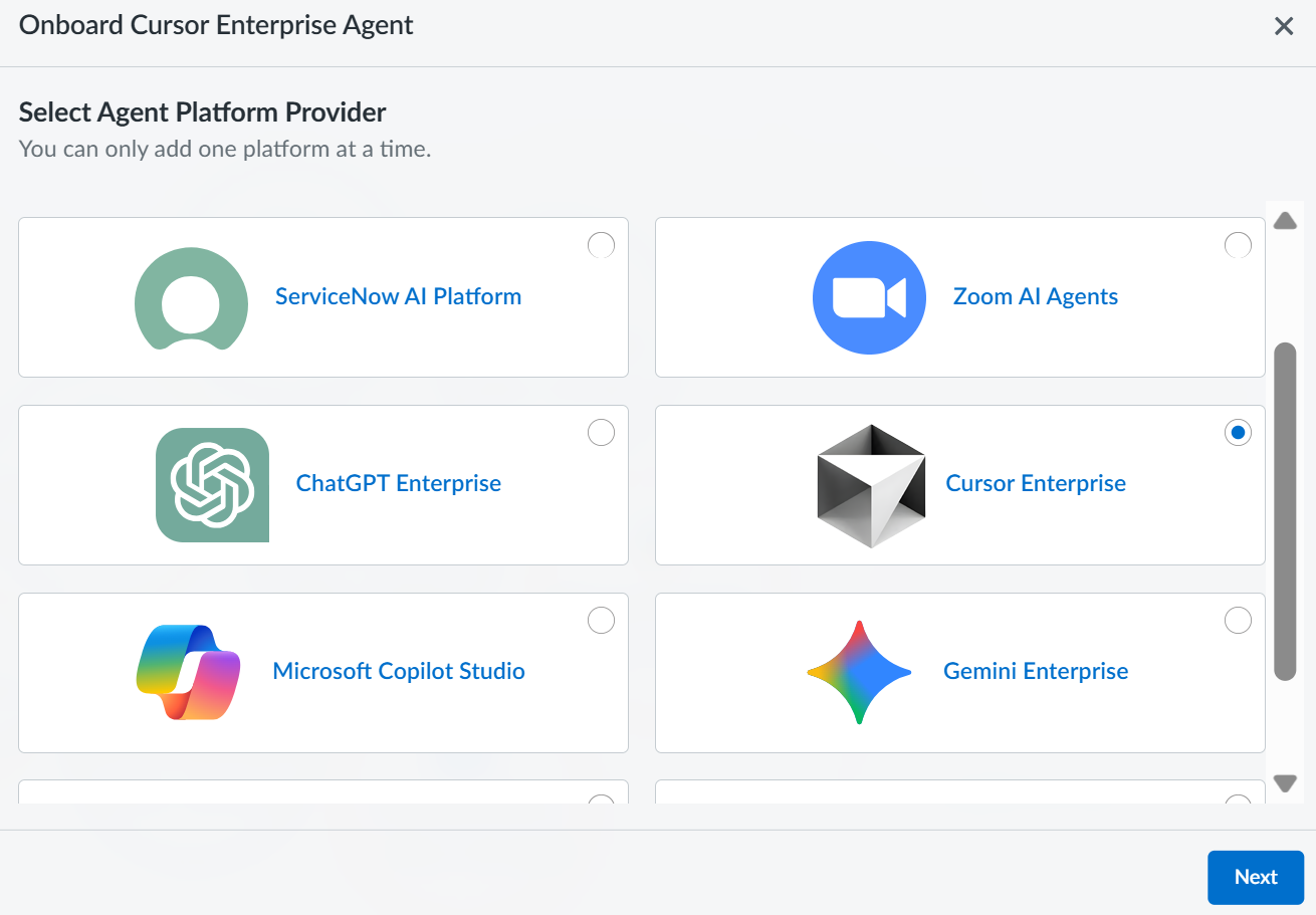 Copy the key and keep it handy for onboarding.To start onboarding Cursor Enterprise to SaaS Agent Security, log in to Strata Cloud Manager.Select AI SecuritySaaS AgentsAgent Platform OnboardingOnboard Agent PlatformCursor Enterprise.