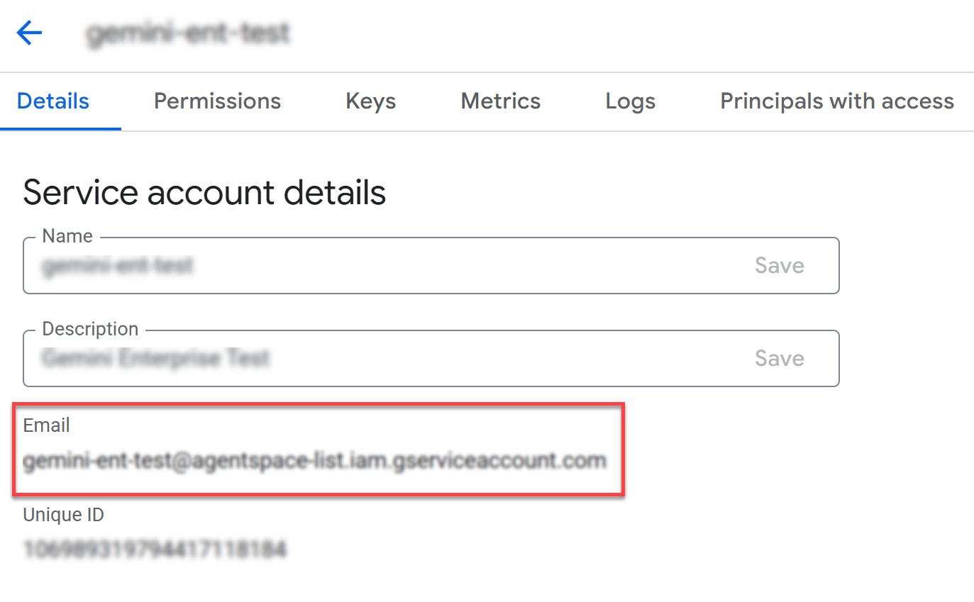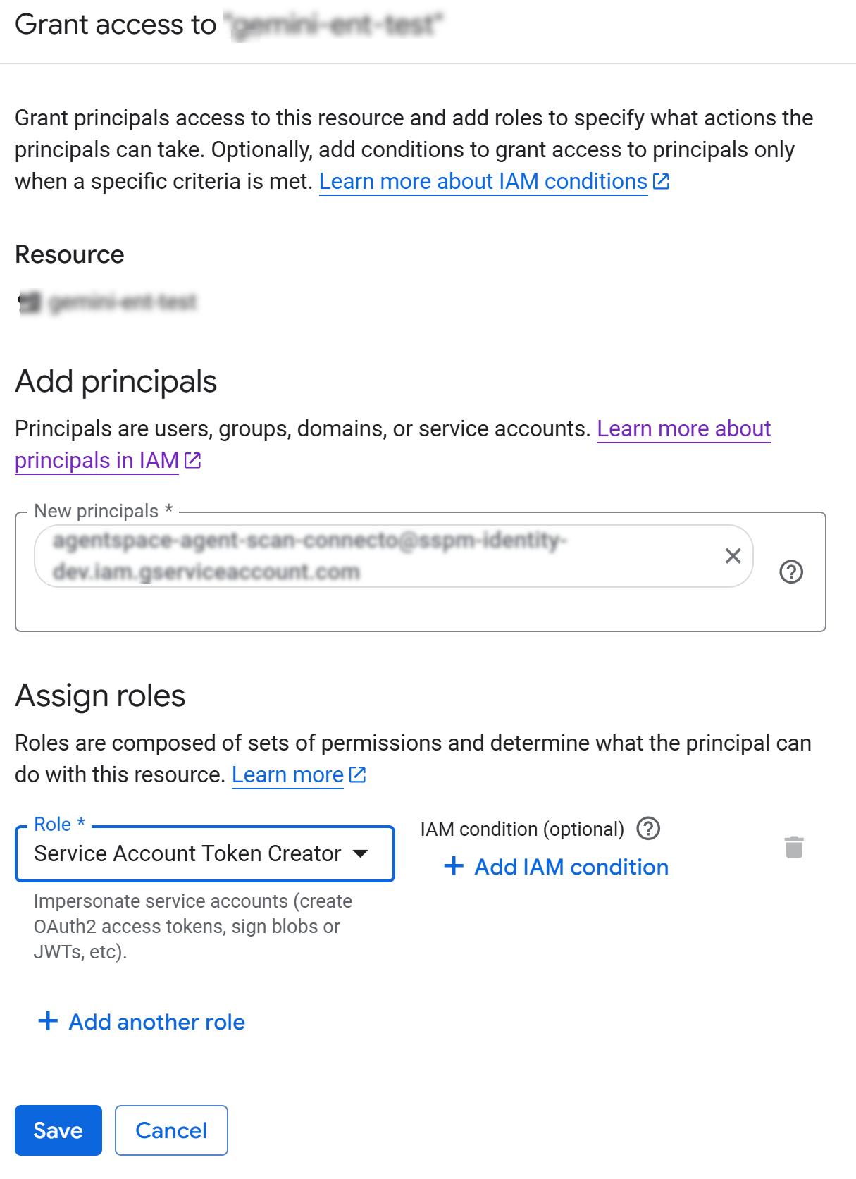 Copy the service account email address and keep it handy for onboarding later.Select Principals with accessView by principalsGrant access.In the Add principals section, specify the name of the principal.Your service account email has the following template: agentspace-agent-scan-connecto@<region-name>.iam.gserviceaccount.com. The following are the region names for different regions.- US: agentspace-agent-scan-connecto@sspm-identity-us-west2.iam.gserviceaccount.com