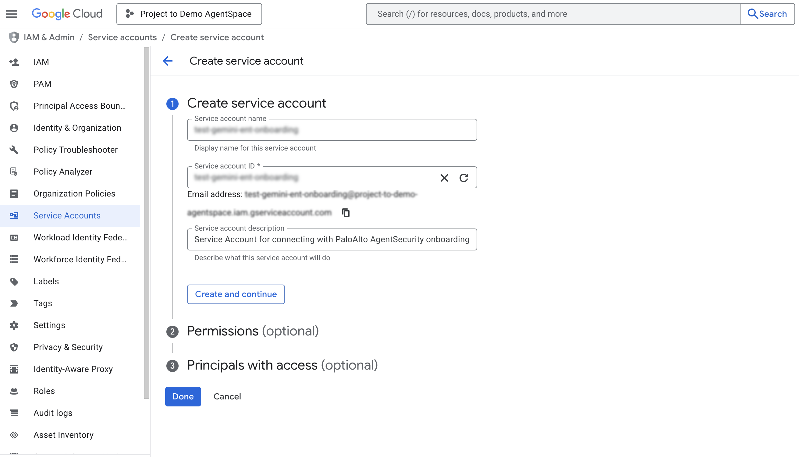 To create a new service account, select MenuIAM & AdminService Accounts+Create service account.Specify a service account name, account ID, and description and click Create and continue.