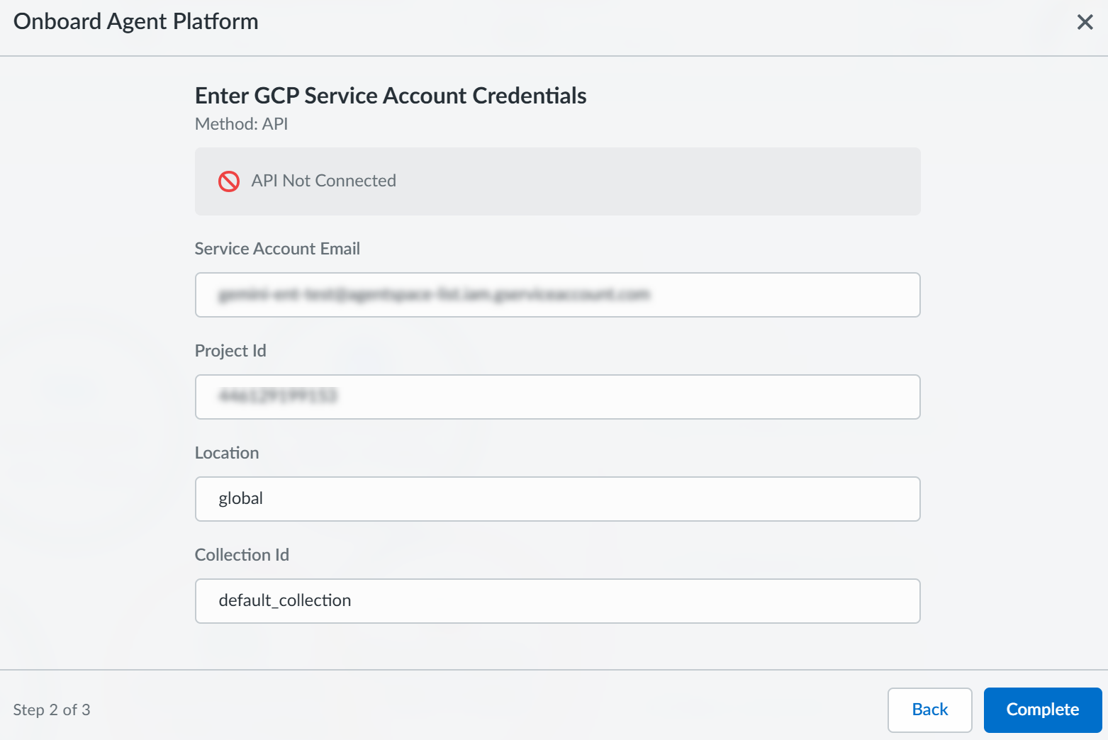 On the Onboard Agent Platform page, enter the following information (that you gathered in STEP 2 and STEP 8) and Complete.- Service Account Email