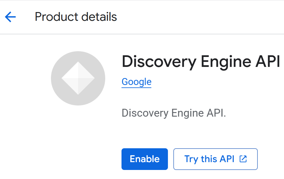 Enable Discover Engine API- From Google Cloud console, select MenuAPIs & ServicesEnabled APIs & Services+Enable APIs and services.Search for Discovery Engine API and enable it.