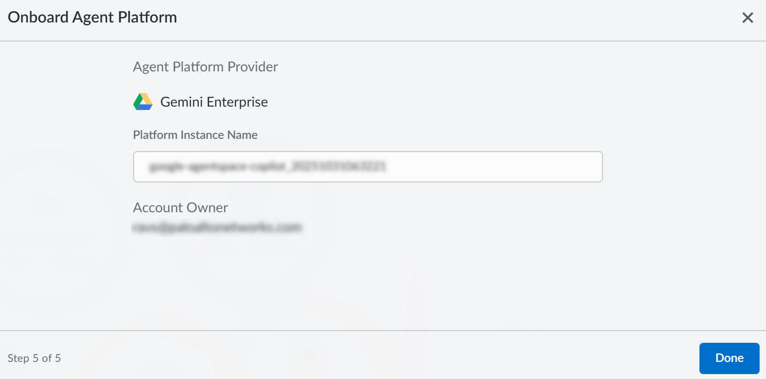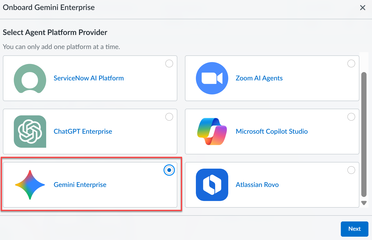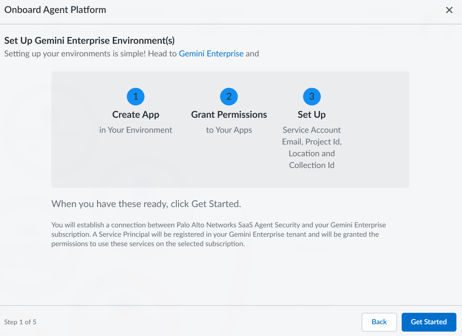 To start onboarding Gemini Enterprise to SaaS Agent Security, log in to Strata Cloud Manager.Select InsightsSaaS AgentsAgent Platform OnboardingOnboard Agent PlatformGemini Enterprise.
