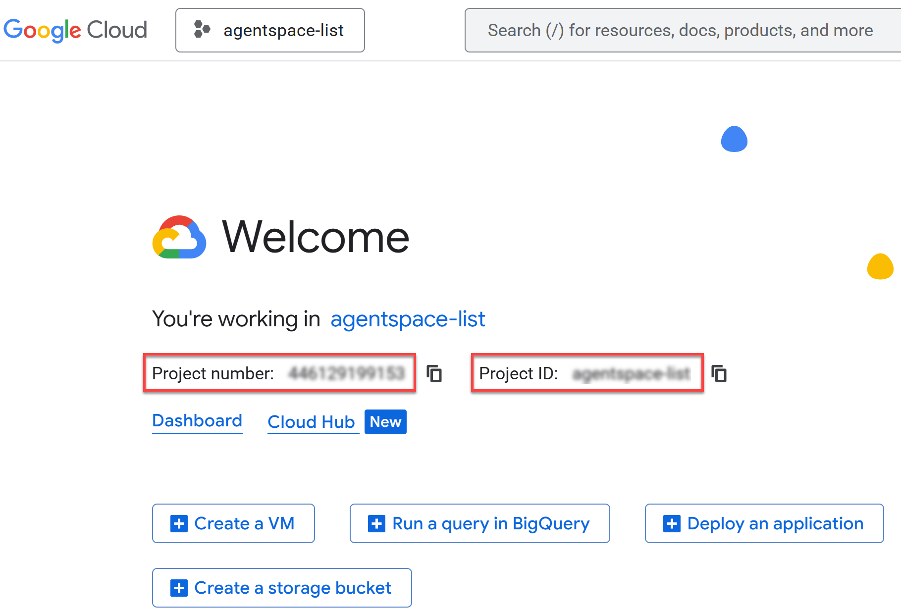 - Go to your project home page (where you developed your agent) in the Google Cloud console.Copy your project ID and project number and keep it handy for onboarding later.