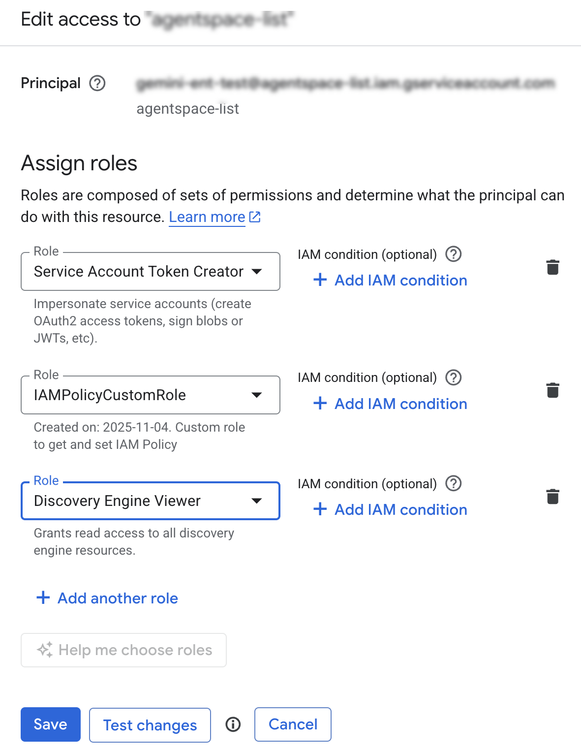 In the Permissions section drop-down, choose Service Account Token Creator, <your custom role>, Discovery Engine Viewer roles and click Save.