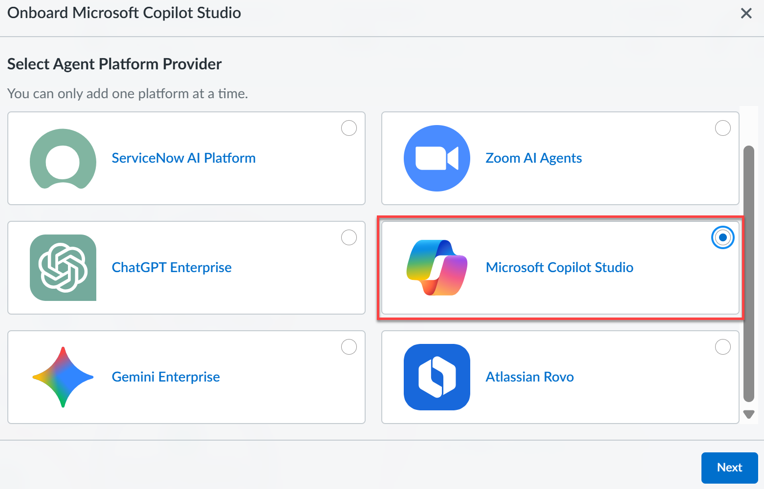 Onboard Microsoft Copilot Studio to SaaS Agent Security.- To start onboarding Microsoft Copilot Studio to SaaS Agent Security, log in to Strata Cloud Manager.Select InsightsSaaS AgentsAgent Platform OnboardingOnboard Agent PlatformMicrosoft Copilot Studio and click Next.