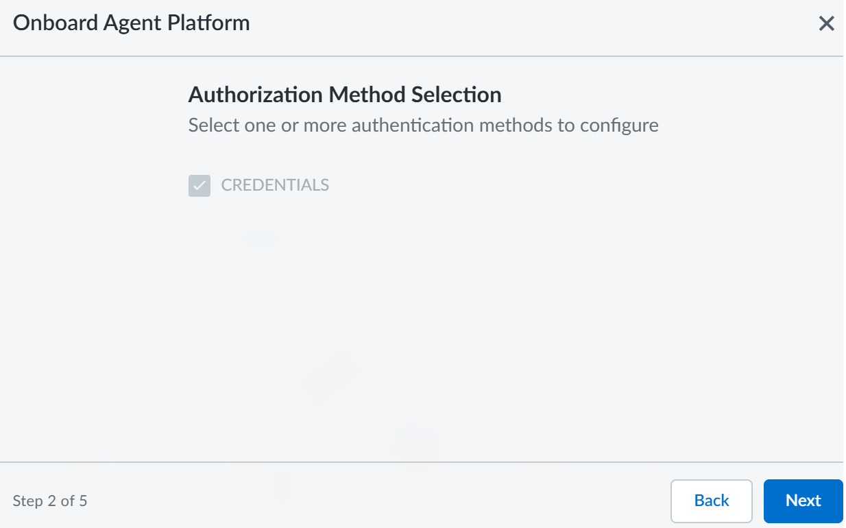 On the Authorization Method Selection page, the CREDENTIALS method is selected by default. Click Next.The CREDENTIALS method uses data extraction to fetch the agent activity details from your SaaS application tenant.