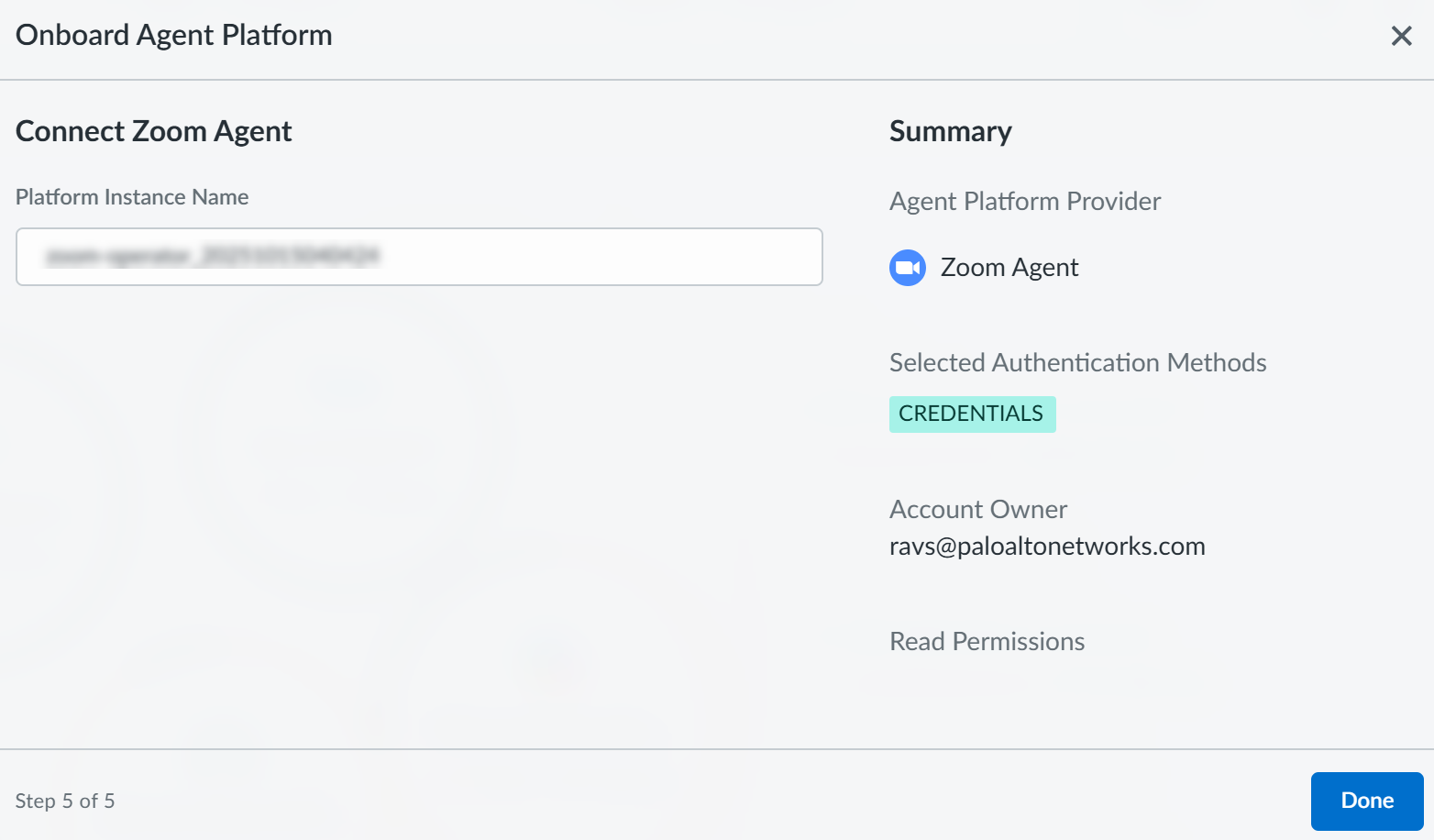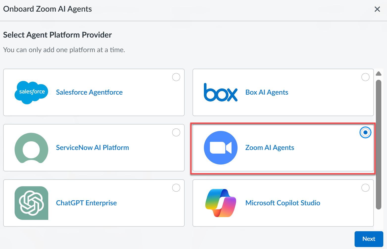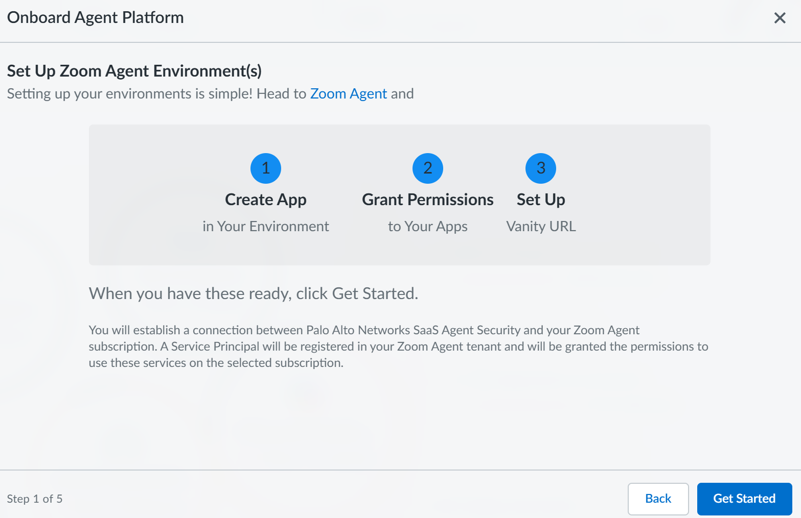 - To start onboarding Zoom AI Agents to SaaS Agent Security, log in to Strata Cloud Manager.Select InsightsSaaS AgentsAgent Platform OnboardingOnboard Agent PlatformZoom AI Agents.