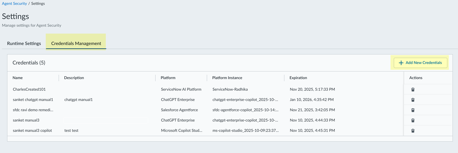 - Log in to Strata Cloud ManagerSelect InsightsSaaS Agents.In the Insights menu, the SaaS Agents item is located in the AI AGENT SECURITY section.In the upper-right corner of the SaaS Agent Security dashboard, click the settings icon.On the Settings page, select Credentials Management.The Credentials Management tab lists the active remediation credentials that are available, and identifies the platform instances that they can access. The list also shows when the credentials will expire.