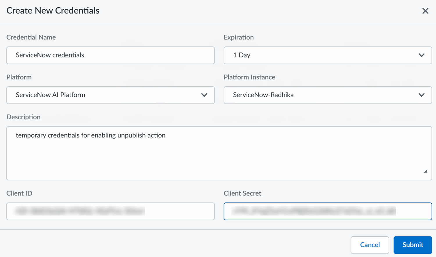 - To close the Create New Credentials dialog and create the remediation credential, Submit.
