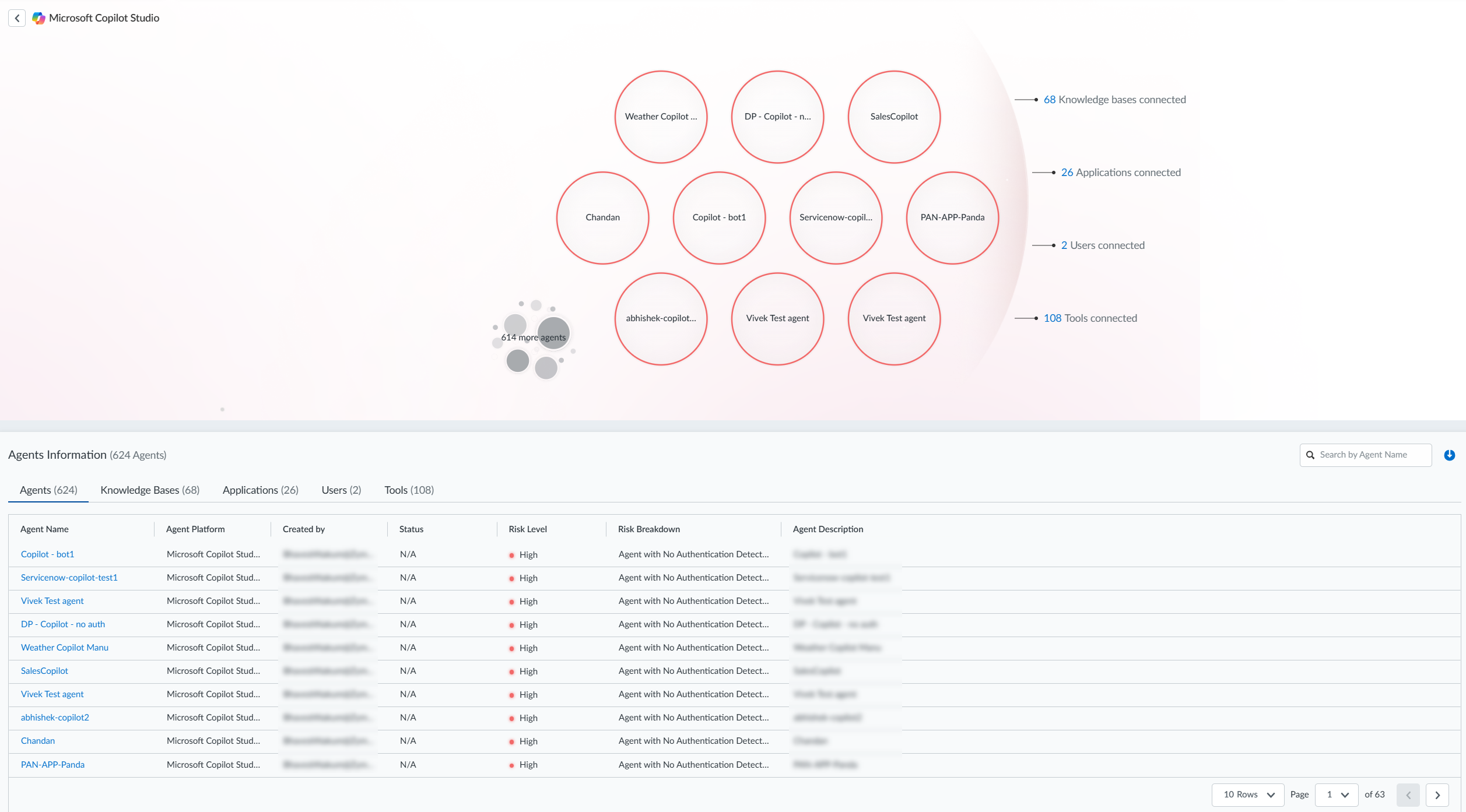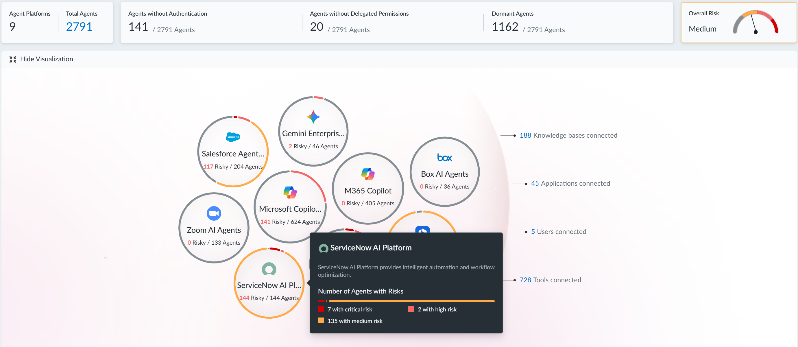 The upper section of the page shows the following information:- A visualization of the agentic platforms that you have onboarded to SaaS Agent Security. You can hover over a platform to view a summary of the risky agents that SaaS Agent Security detected in the platform. Risky agents are agents with a calculated risk severity of Critical, High, or Medium.