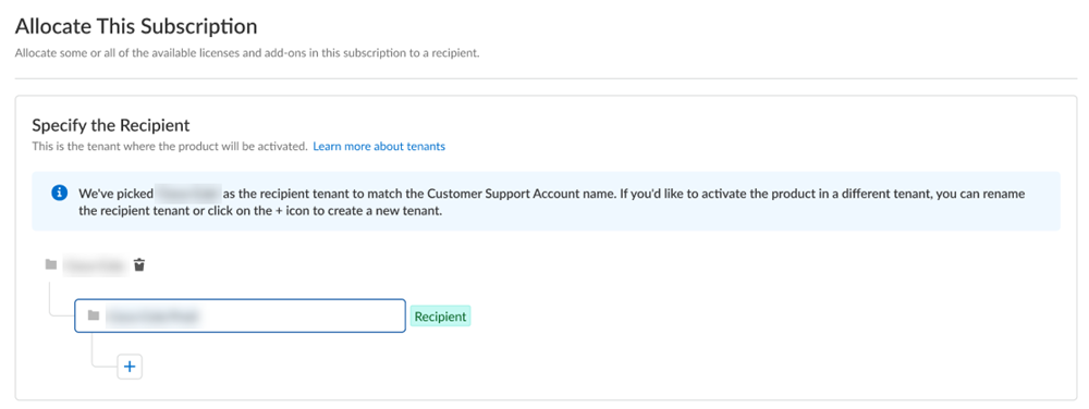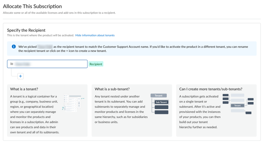 Allocate the product to the Recipient of your choice.You can allocate your entire license to one recipient or you can share it with multiple recipients in a tenant hierarchy.- If you need just one tenant, use or rename the tenant provided. The name provided matches your Customer Support Portal account for convenience.