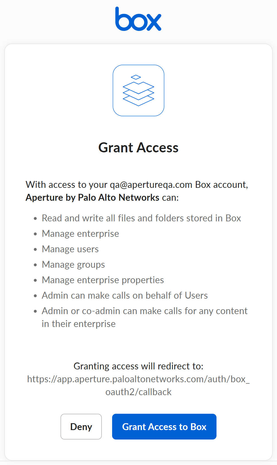 Click Connect Box to Data Security.Enter the email address and password for the administrator account you want Data Security to use when connecting to Box and then Authorize.Data Security validates the administrator account and if the account has the right authentication permissions to access all the Box assets. If the account does not have adequate permissions, an onscreen status displays an error alerting you to fix the issue.