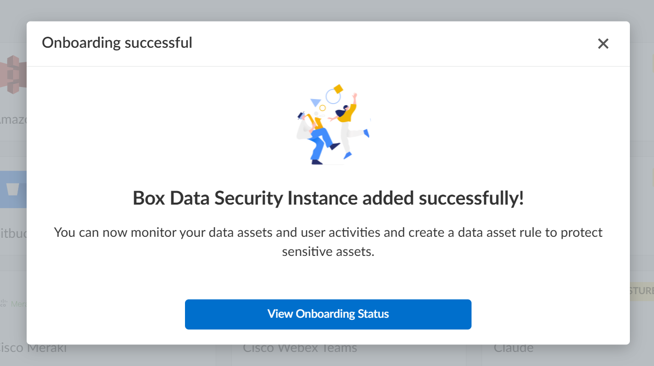 Click View Onboarding Status to know if the validation checks have passed. You will be able to start scanning only after successful validation.Optional After authentication, Data Security adds the new Box app to the Cloud Apps list as Box n, where n is the number of Box app instances that you connected to Data Security. For example, if you added one Box app, the name displays as Box 1. You’ll specify a descriptive name soon.Next step: Proceed to Start Scanning the Box App and Monitor Results.Troubleshooting Onboarding for Box App