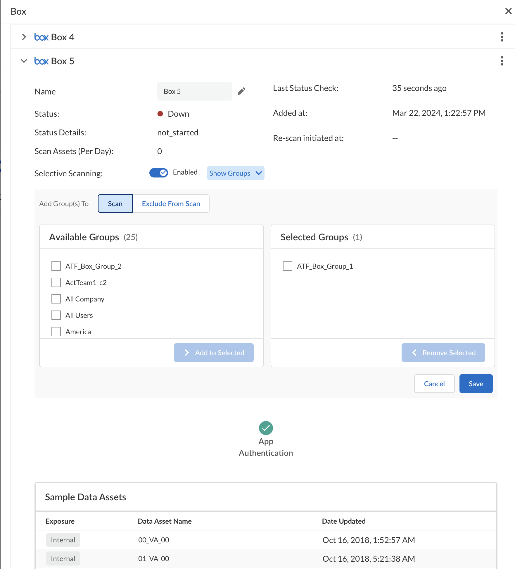 Perform selective scanning on your Box app. - (Optional) Enable group-based selective scanning.Integrate Cloud Identity Engine with Data Security if you plan to use selective scanning before adding your Box application so that Data Security can discover and scan assets belonging to the user groups you want to monitor.You cannot change the status of selective scanning for your Box app that has already started scanning.You can choose to either Scan or Exclude From Scan your user groups.Choose your groups from the Available Groups list and move them to the Selected Groups list.Save your changes.