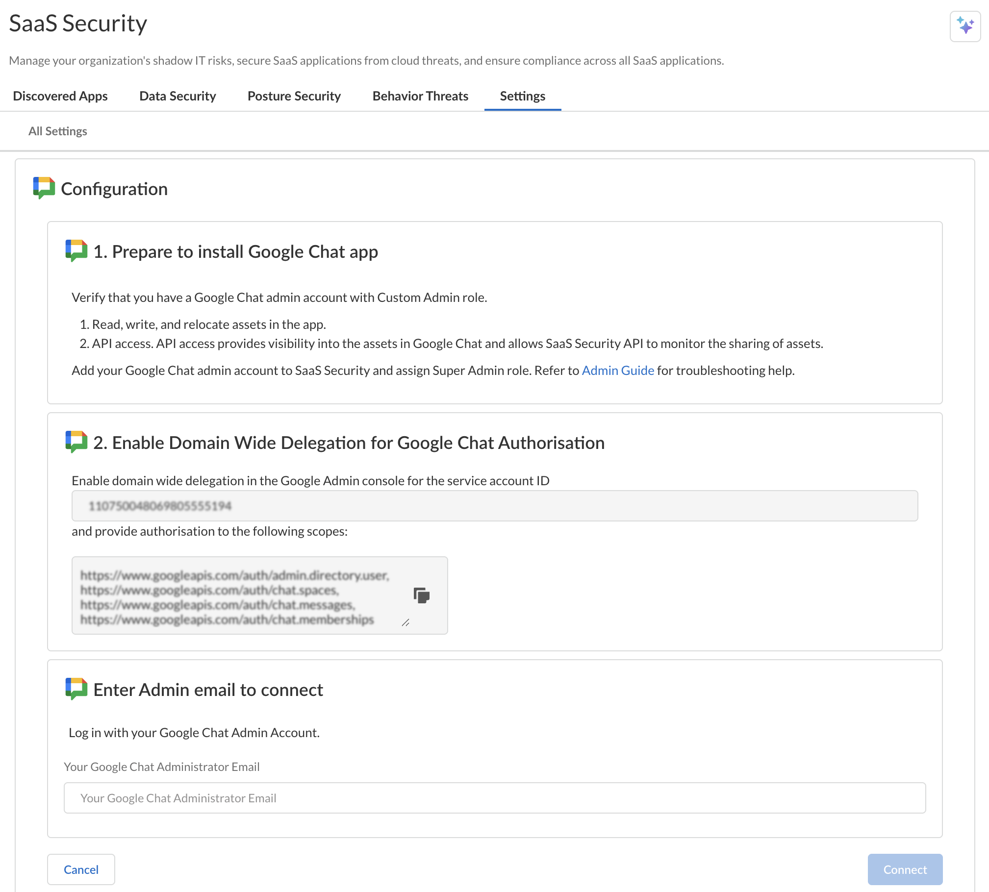 As indicated in the onscreen Configuration wizard (screenshot above), Prepare to Add Google Chat App.To onboard your Google Chat app, follow steps 4 to 6 to set up your Domain Wide Delegation mentioned in the Prepare to Add Google Chat App section.Follow the final step in the onscreen Configuration wizard: Enter Admin email to connect and Connect.After you enter the Google Chat admin email, the Google Chat app is installed.