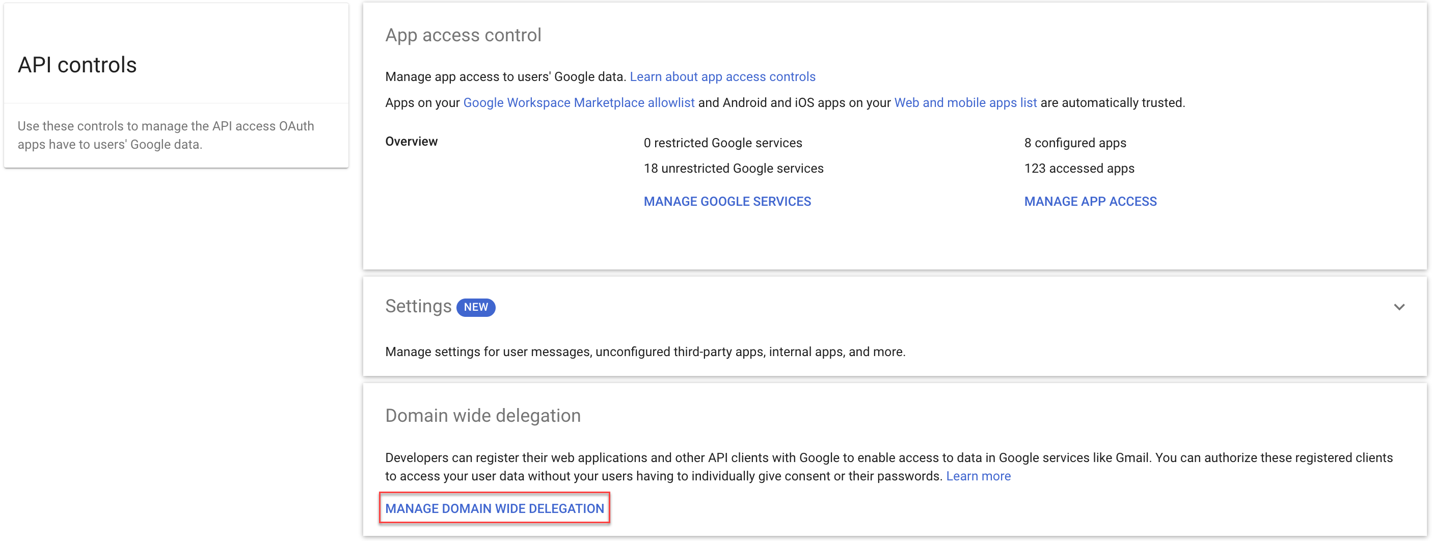 Enable API client access to Google Cloud Storage.- Log in to Google Admin Console as the Google Cloud Storage administrator.The admin console isn't the same as the cloud console that you’ve been accessing up to this point in this procedure; rather, the admin console is a different console.Select SecurityAccess and Data ControlAPI ControlsDomain wide DelegationMANAGE DOMAIN WIDE DELEGATION.Trust internal, domain-owned apps isn't needed for onboarding the Google Cloud Storage app; however, GCP web interface enables this setting by default. You can safely disable this setting if you want.