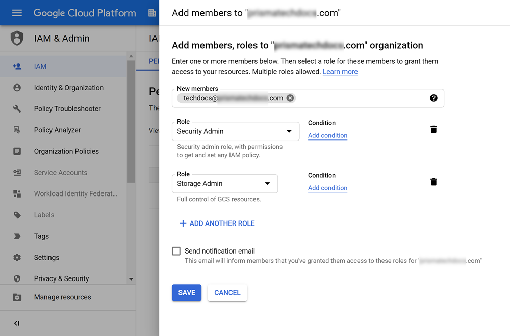 Provide the local admin account with the required roles.You’ll use this admin account to onboard Data Security. This admin account does not need to be a Super Admin; however, the admin account does require minimum permissions at the organization level—Storage Admin and Security Admin permissions.- Log in to Google Cloud Console as Super Admin.At the top of the screen and in the project list, select your organization.Select IAM & AdminIAM, then Grant Access.Add your account as Security Admin and Storage Admin.