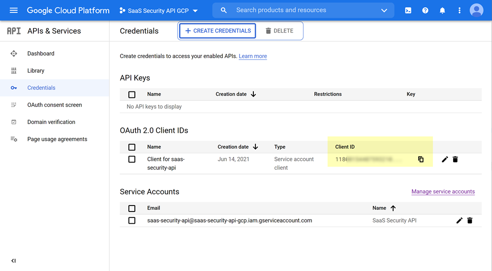 Download Private Key for the new service account.GCP creates a service account client when domain-wide delegation is enabled on a service account.- Select Menu (three horizontal bars icon)APIs & ServicesCredentials.In Service Accounts locate the service account you created above and Edit service account.Record the Email, which you’ll use to specify the Service account ID later on SaaS Security web interface.Select KEYSADD KEYCreate new keyJSONCREATE.The key is downloaded automatically on your device. Upload the key during onboarding.