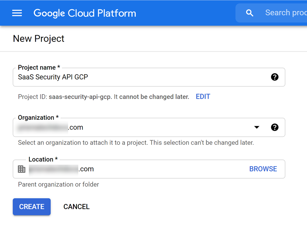 - In the drop-down at the top of the screen, open your project list, then NEW PROJECT.Name your project (for example, Data Security GCP), select your organization (domain), then CREATE the project.