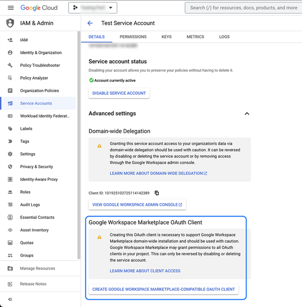 Store the JSON key in a secure location as the key can't be recovered if lost.Data Security requires this key when you Add Google Cloud Storage App.Save your changes.To create a service account client, select Service AccountsAdvanced settings. Click CREATE GOOGLE WORKSPACE MARKETPLACE-COMPATIBLE OAUTH CLIENT. You’ll then be able to see the same client in the OAuth 2.0 Client IDs list.