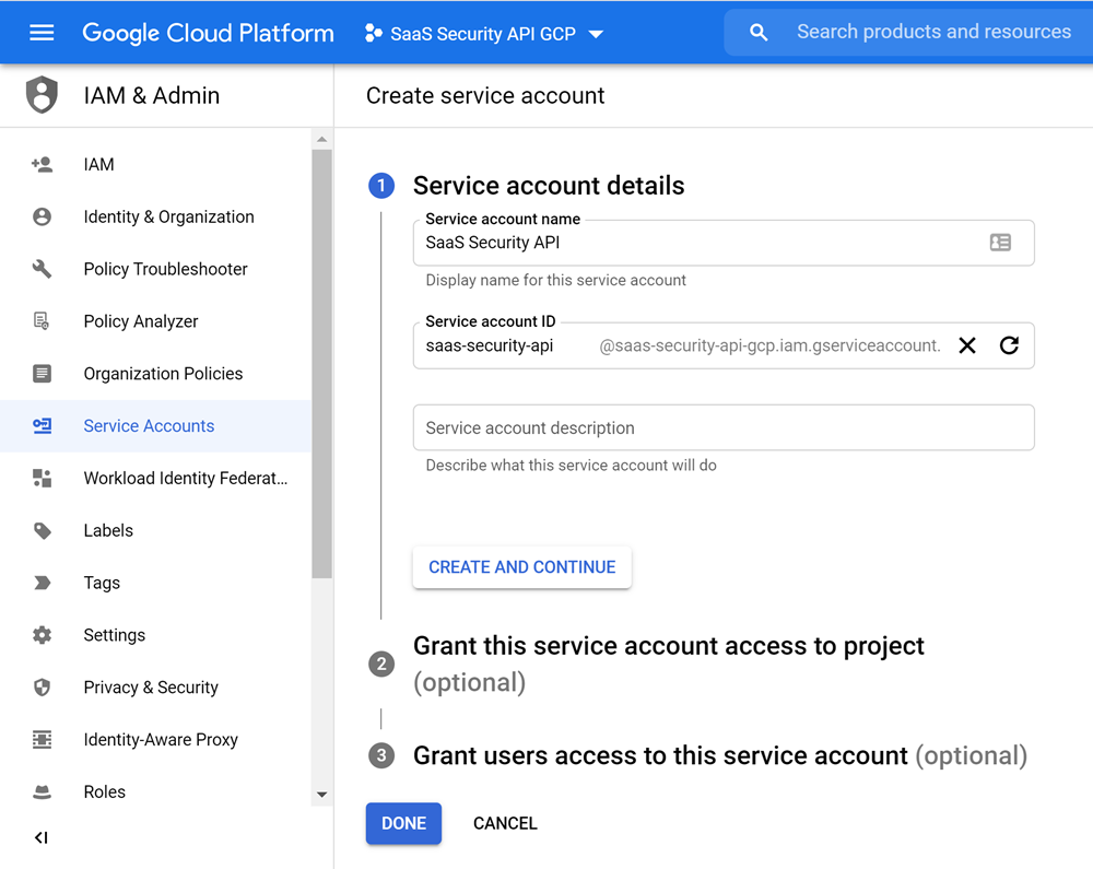 - Select Menu (three horizontal bars icon)APIs & ServicesCredentialsCREATE CREDENTIALS.Select Service account and specify a Service account name (for example, Data Security), which automatically populates the Service account ID, then CREATECONTINUEDONE, authorizing no optional permissions or access.