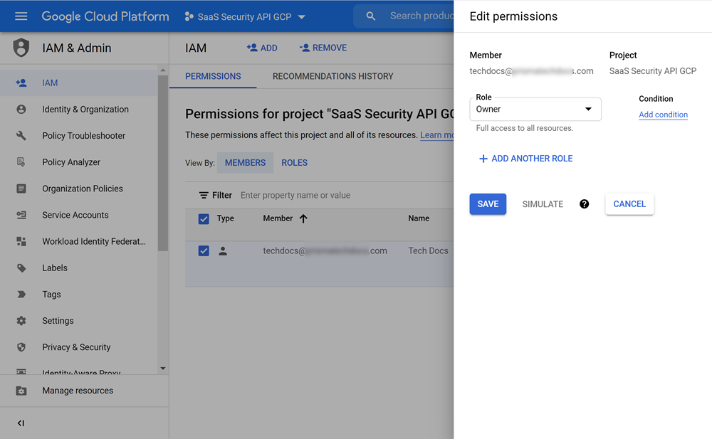 If you want to onboard the Google Cloud Storage app using an existing GCP project and service account, set up your admin account as the project IAM owner and service account owner. If you don’t have an existing project or service account, Create a Service Account for Google Cloud Storage instead.- Log in to Google Cloud Console as Super Admin.Set permissions for the existing project.