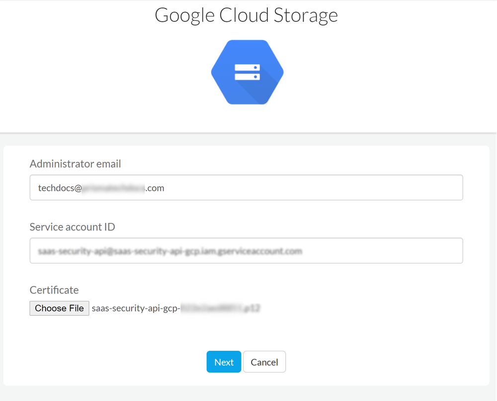 Select Google Cloud Storage and then Connect to Account.Enter the Google Administrator email to which you granted roles in 9.d.Enter Service account ID that you created in 4.b.Upload P12 Certificate GCP issued in 5.d.Click Next to add the cloud app.