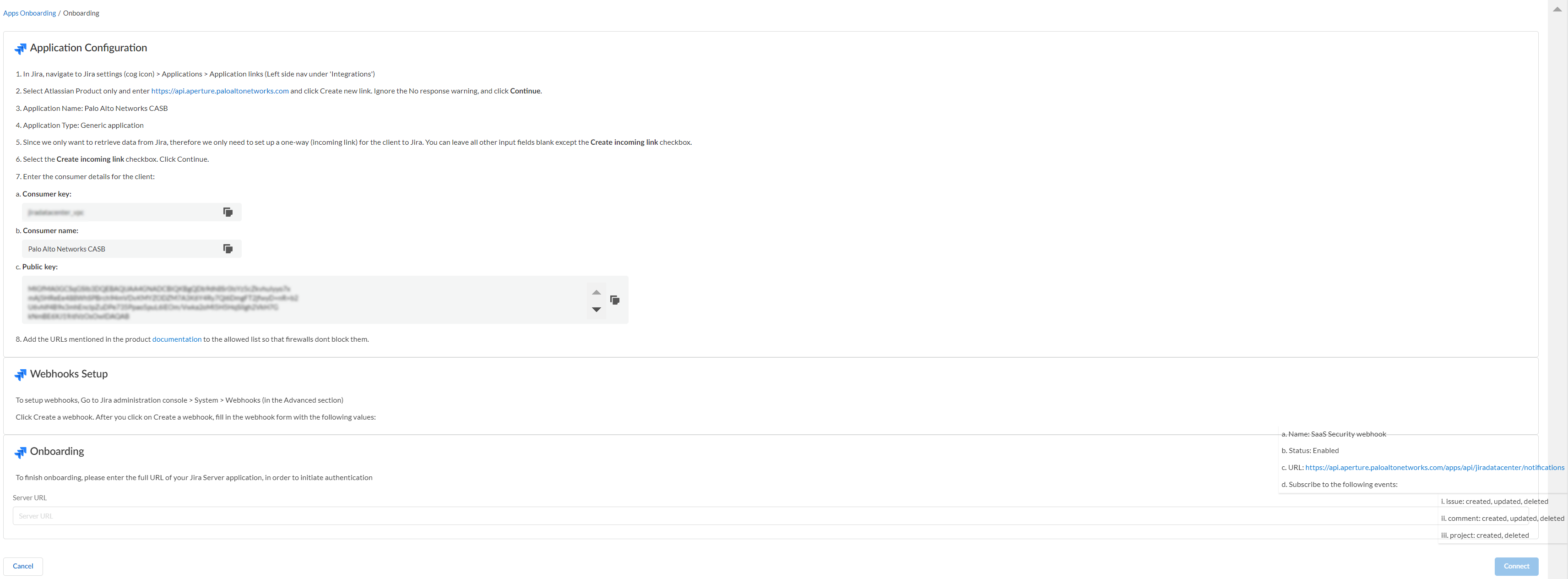 Sign in to the Atlassian workspace with an account that has workspace-level Administrator permissions.Follow the onscreen instructions in Step 1: In Jira Data Center, select Jira settings (cog icon) > Applications > Application links > Create Link.Follow the onscreen instructions in Step 2: In the Create Link page, ensure that Atlassian product is selected. Enter the tenant home page address. Ignore the No response warning, and click Continue.Follow the onscreen instructions in Step 3: In the Link applications page, enter the Application Name as Palo Alto Networks CASB.Follow the onscreen instructions in Step 4: Choose the Application Type as Generic application from the drop-down.Because you are only retrieving data from Jira, you only need to set up a one-way (incoming link) communication for the client to Jira. You can leave all other input fields blank.Follow the onscreen instructions in Step 6: Select the Create incoming link check box. Click Continue.Follow the onscreen instructions in Step 7: The following consumer details for the client are provided in your wizard:- Consumer key