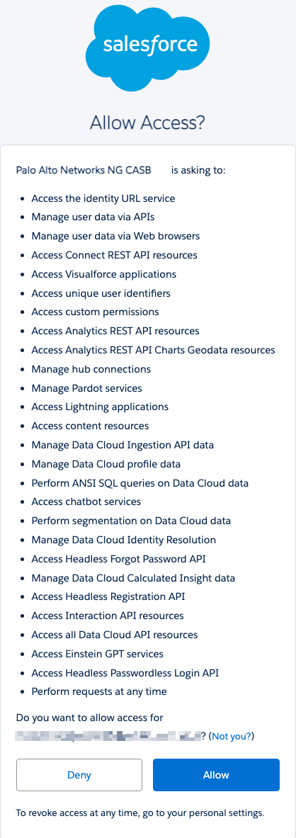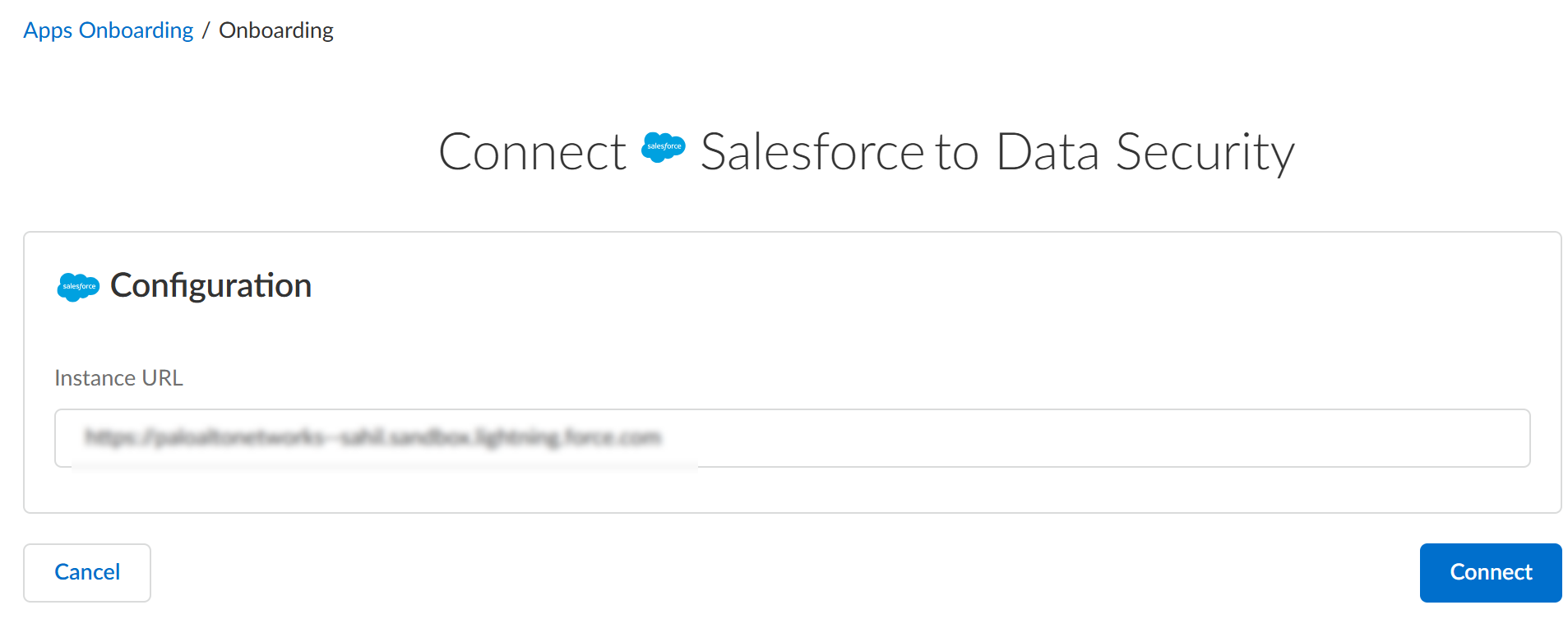 (Optional): Ensure you have added the region-specific IP addresses to the allowed list on your NGFW or Prisma Access tenant so that these IP addresses are not blocked.Add Salesforce to Data Security- Log in to Strata Cloud Manager.(Recommended) Add your Salesforce domain as an internal domain.If you modify the internal domain after you have started scanning, Data Security will change the exposure of the newly detected assets only.Select ConfigurationSaaS SecurityData SecurityApplicationsAdd ApplicationSalesforce.