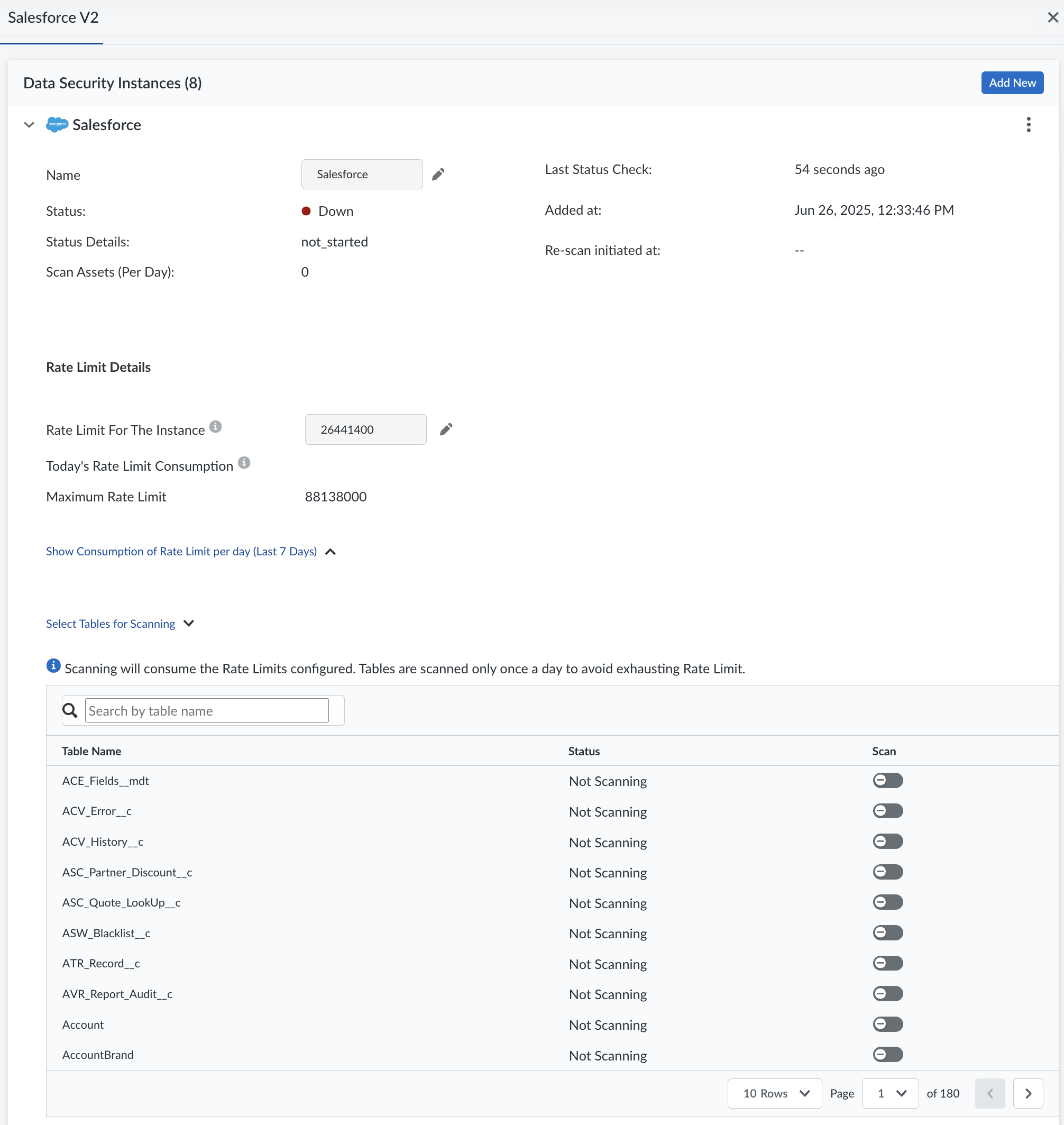 (Optional) Give a descriptive name to the Salesforce instance to differentiate this instance of Salesforce from other instances.(Optional) Adjust the Rate Limits Details allowed for your instance.By default, Data Security can send a maximum of 30% of your available API calls in your Salesforce license. You can modify this parameter.(Optional) Select the tables you want to scan and Save.- API usage increases significantly as you keep adding tables to scan.