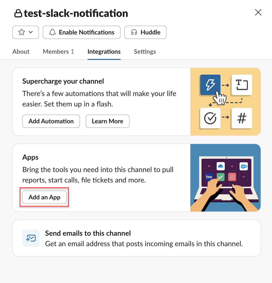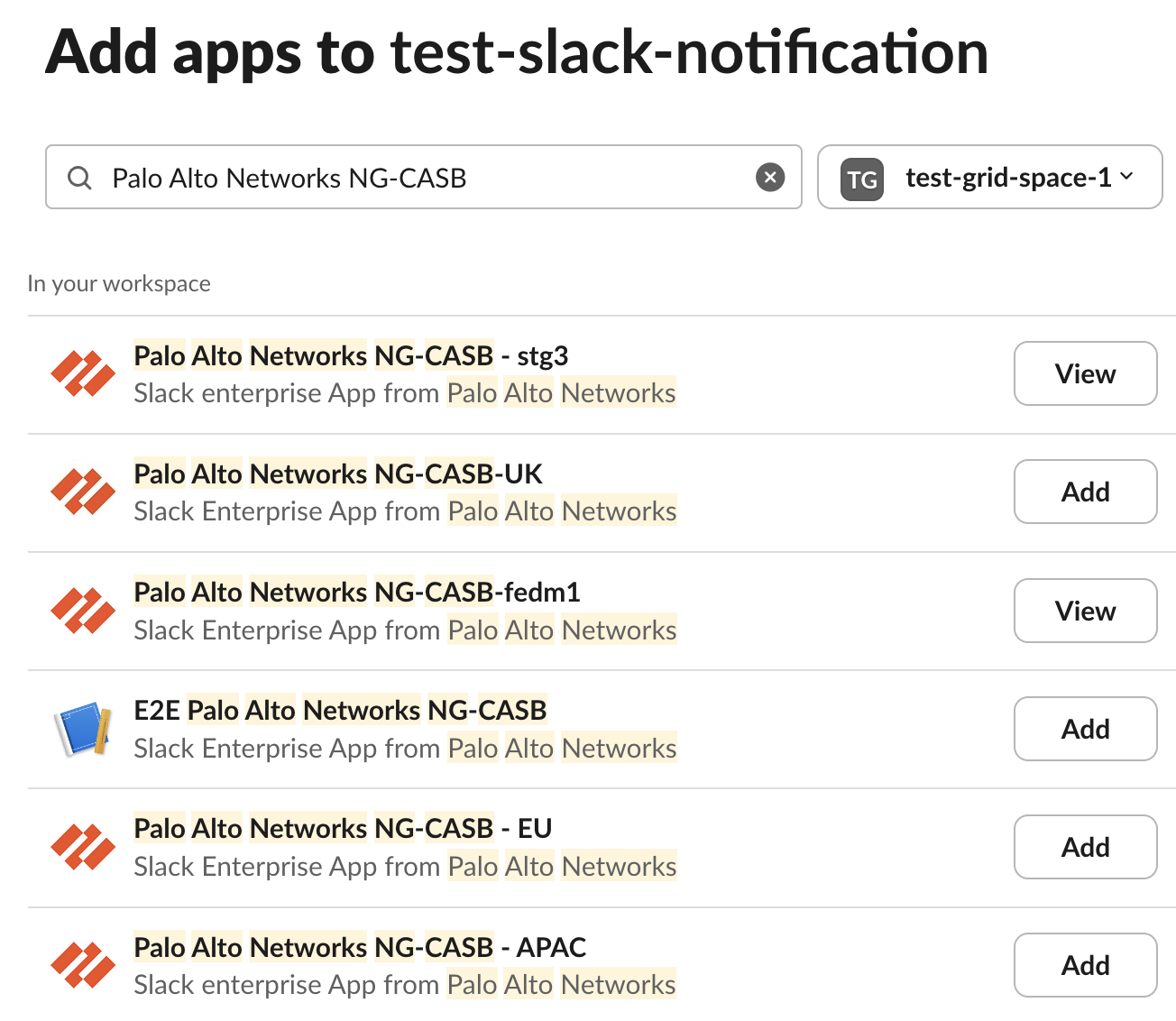 the notifications to be sent. To do this, select <Your Slack Channel>IntegrationsAdd an App<App Name of Your Region>. Following are the app names for specific regions: