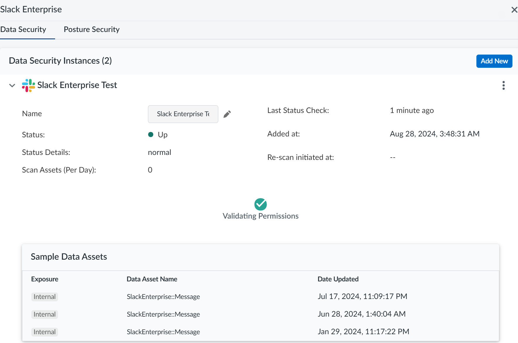 (Optional) Customize your Slack instance.Give a descriptive name to the Slack Enterprise instance to differentiate this instance of Slack Enterprise from other instances.Add policy rules.When you add a cloud app, Data Security automatically scans the app against the default data patterns and displays any match occurrences. As a best practice, consider the business use of your app to determine whether you want to Add a New Data Asset Policy Rule to look for incidents unique to Slack Enterprise.Configure or edit a data pattern.You can Configure Data Patterns to identify specific strings of text, characters, words, or patterns to make it possible to find all instances of text that match a data pattern you specify.Start Scanning Slack Enterprise App.To start scanning the new Slack Enterprise app for risks, select ConfigurationSaaS SecurityData SecurityApplicationsSlack EnterpriseView Settings...Start Scanning.Data Security scans all assets in the associated Slack Enterprise App and identifies incidents. Depending on the number of Slack Enterprise users and assets, it might take some time for Data Security to complete the process. However, you can Monitor Scan Results on the Dashboard and begin to Assess Incidents. Monitoring the progress of the scan during the discovery phase enables you to Fine-Tune Policy rules to modify the match criteria and ensure better results.Troubleshooting Onboarding for Slack Enterprise App