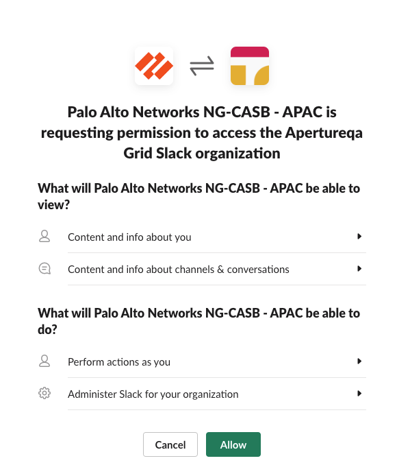 Handling ErrorsTo understand your error messages and ways to resolve them, see:The other most common issues related to onboarding a Slack Enterprise app are as follows:SymptomExplanationSolutionWhen you attempt to log in to your Slack administrator account during the onboarding process, an authorization error is returned: Something went wrong when authorizing Palo Alto Networks NG-CASB for Slack.You have a Slack workspace open in your browser for a workspace other than the workspace associated with the administrator account that you’re using to onboard the Slack Enterprise app or the administrator account isn’t an Organization Owner.Log out of all Slack workspaces and verify that the administrator account is an Organization Owner.If the issue persists, contact SaaS Security Technical Support.