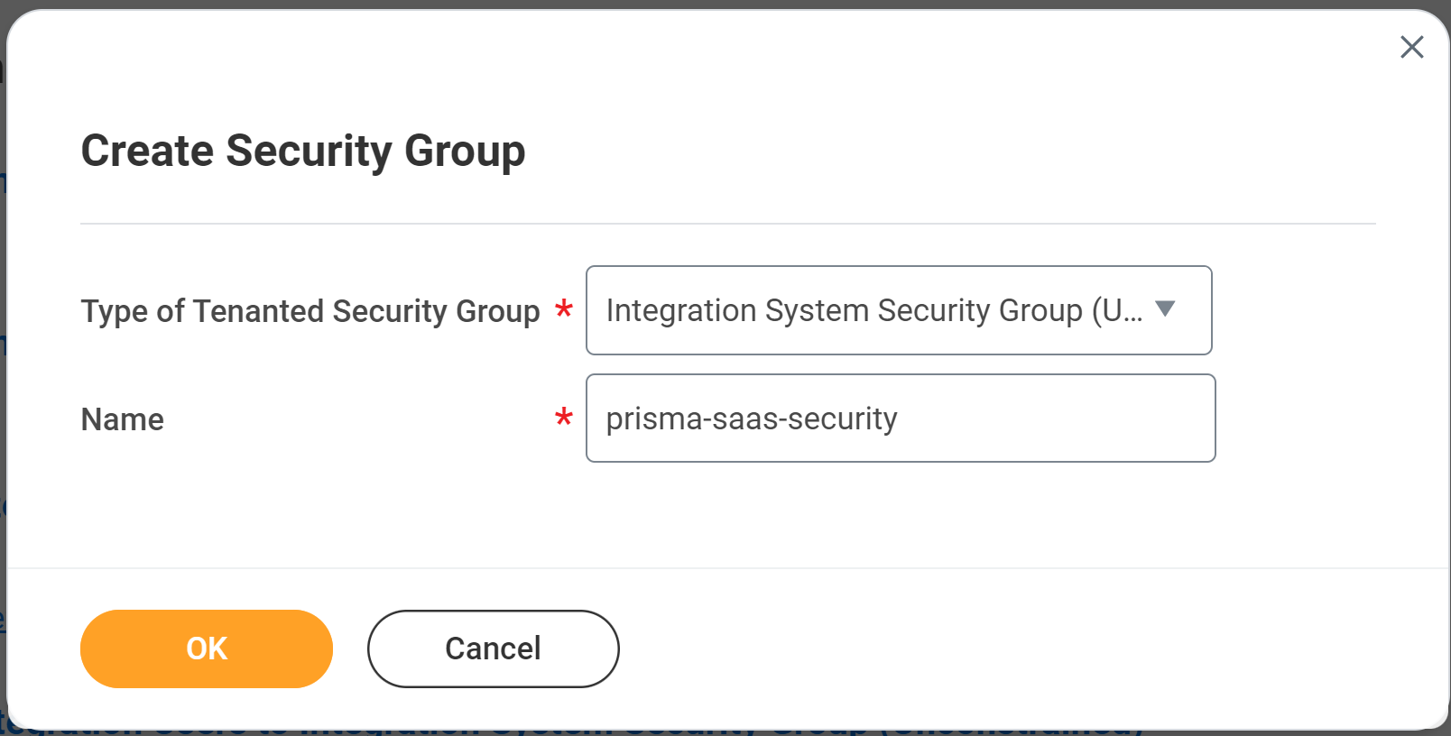 Create Security Group- Search for Create Security Group.In Create Security Group, for Type of Tenanted Security Group, select Integration System Security Group (Unconstrained) from the drop-down and enter a security group name.Click OK.