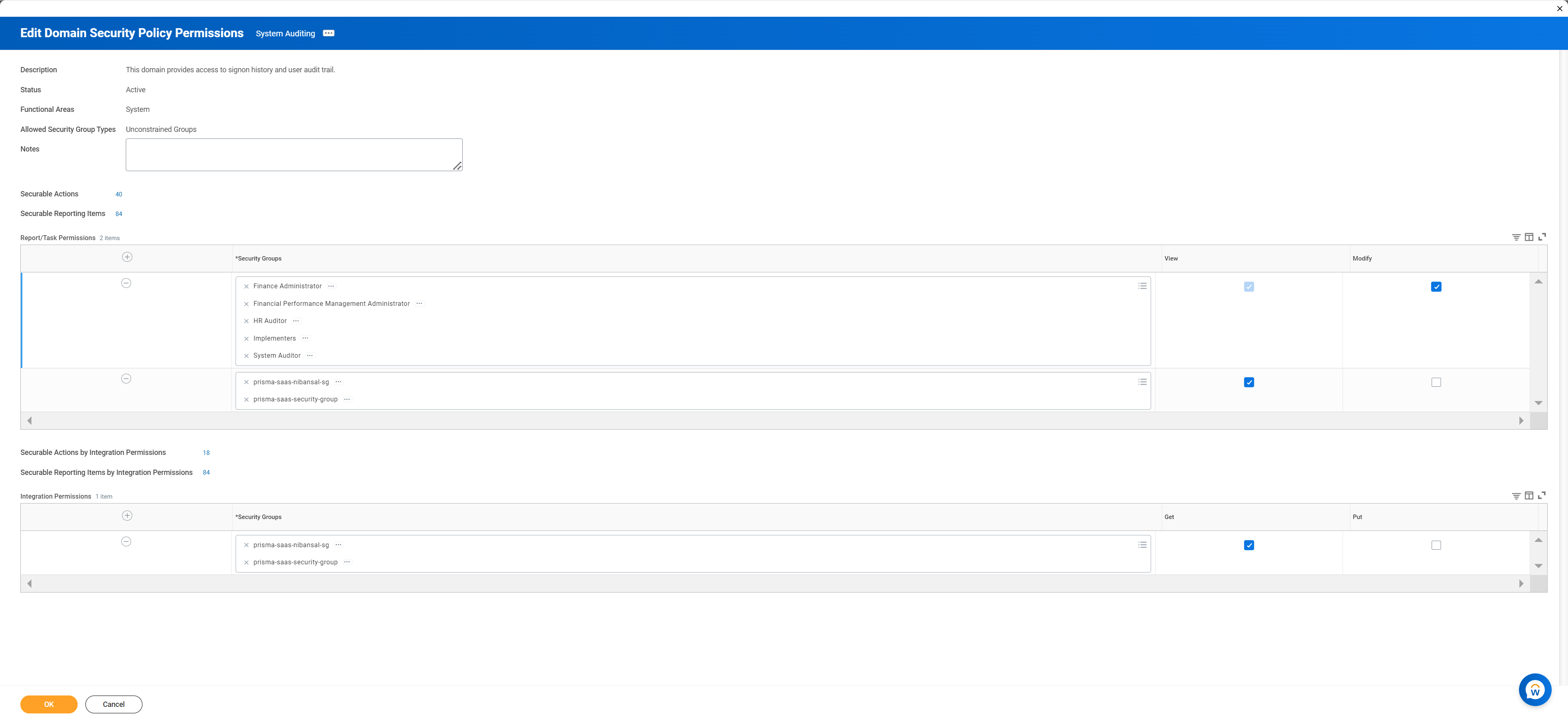 On the Edit Security Group page, choose the system integration user you created earlier for Integration System User.Click OK and then Done.Search for View Domain and select System Auditing.Select Actions (…)DomainEdit Security Policy Permissions.Under Report/Task permissions, search for the security group created earlier and select the View check box.Under Integration permissions, search for the security group created earlier and select the Get check box.Click OK.You can safely ignore alerts about activating pending security policy changes. Activate them after completing the following step.