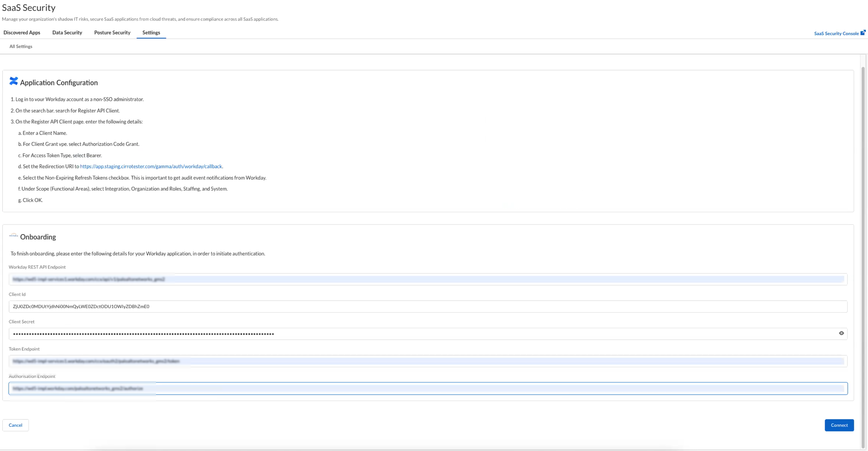 - Create the required User, Roles, and REST client for Strata Cloud Manager to monitor Workday activity.