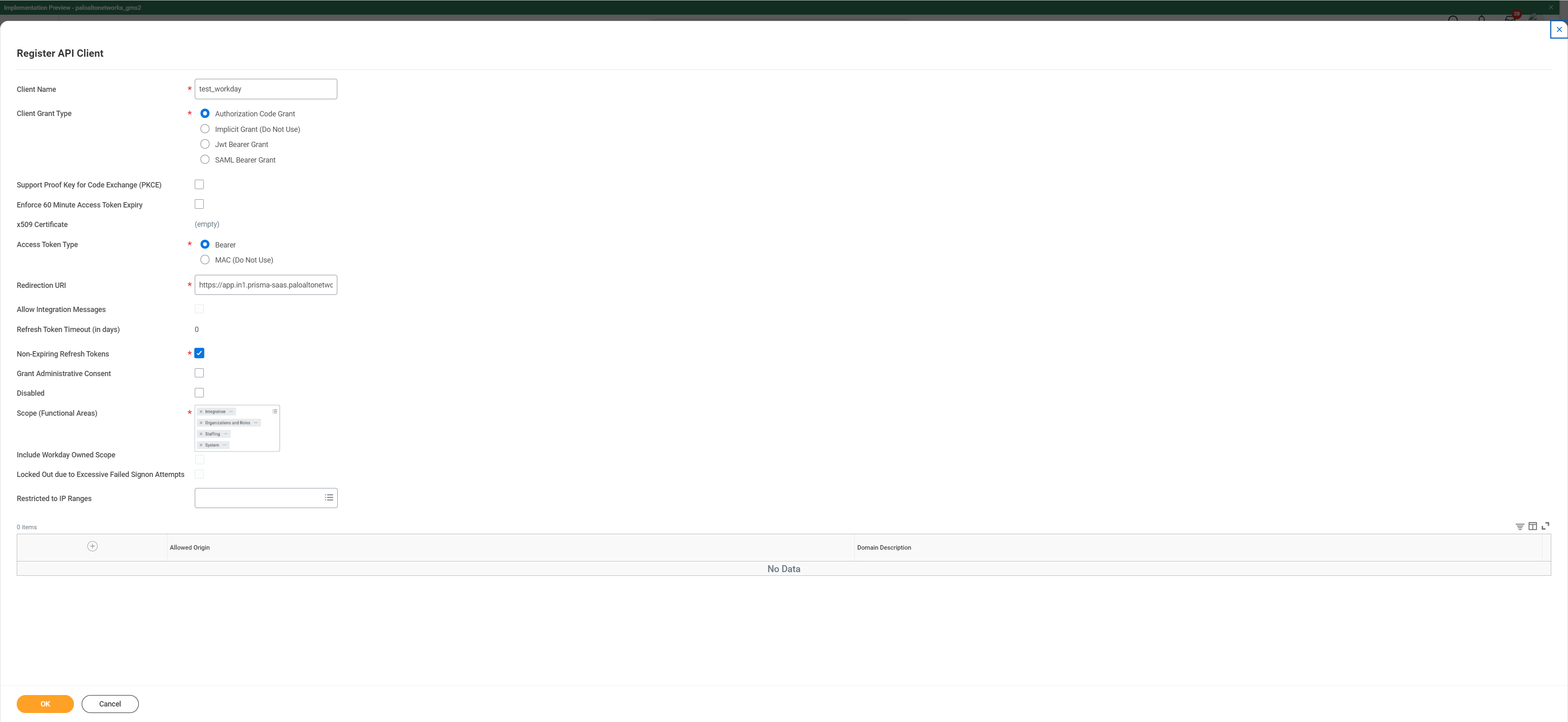 Enable Non Expiring Refresh Tokens.For Scope (Functional Areas), choose all the four: Integration, Organizations and Roles, Staffing, System.Click OK.