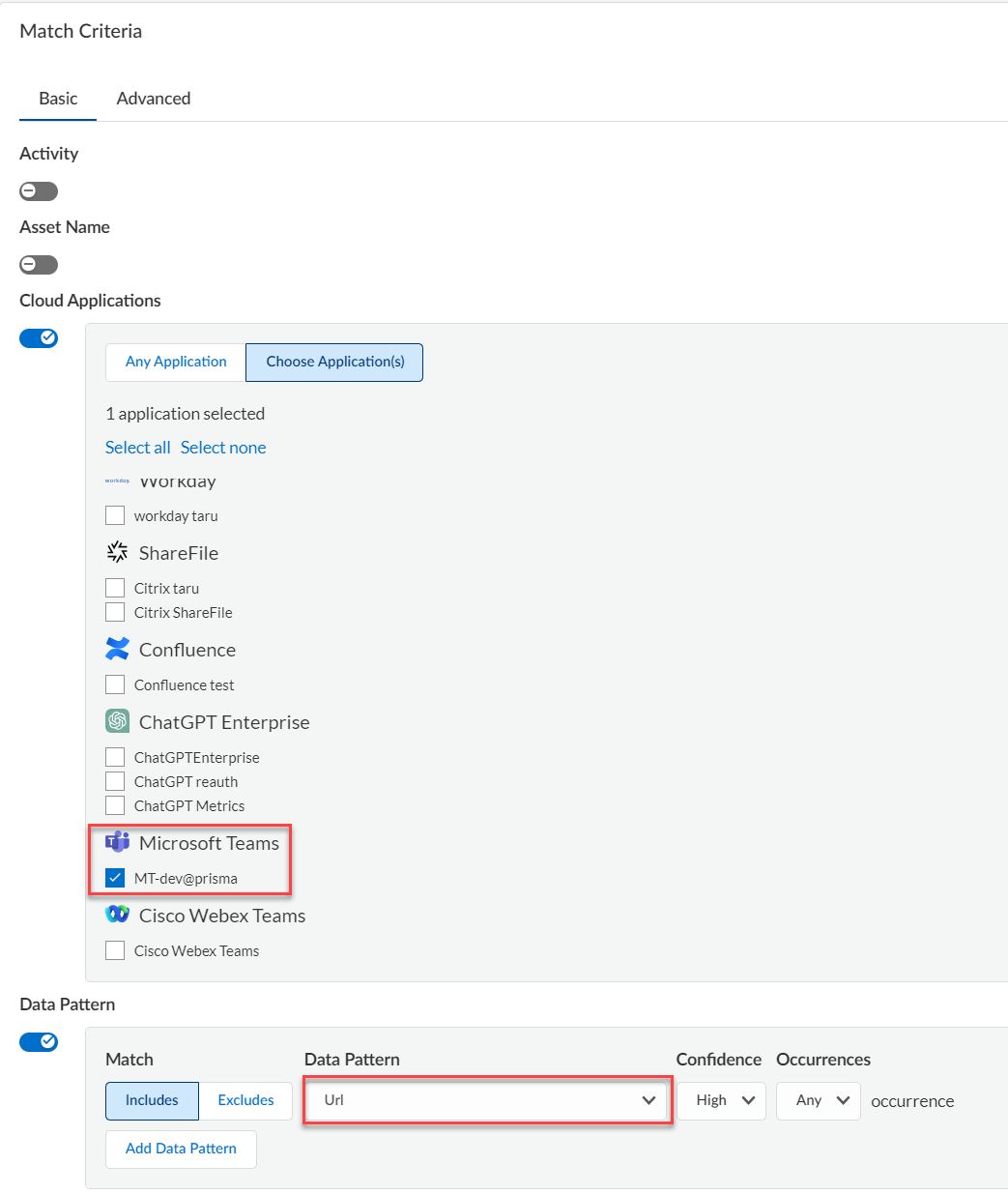 - Log in to Strata Cloud Manager.Select ConfigurationSaaS SecurityData SecurityPoliciesAdd Policy.Enter the basic information such as policy name, description (optional), severity and enable Phishing Analysis.Select the Cloud Applications (currently only instances of Microsoft Teams) you want to analyze for phishing.Select: URL for Data Pattern or Phishing for Data Profile as match criteria.