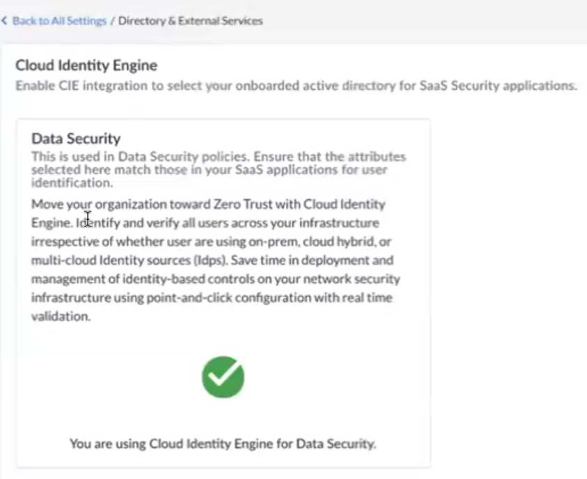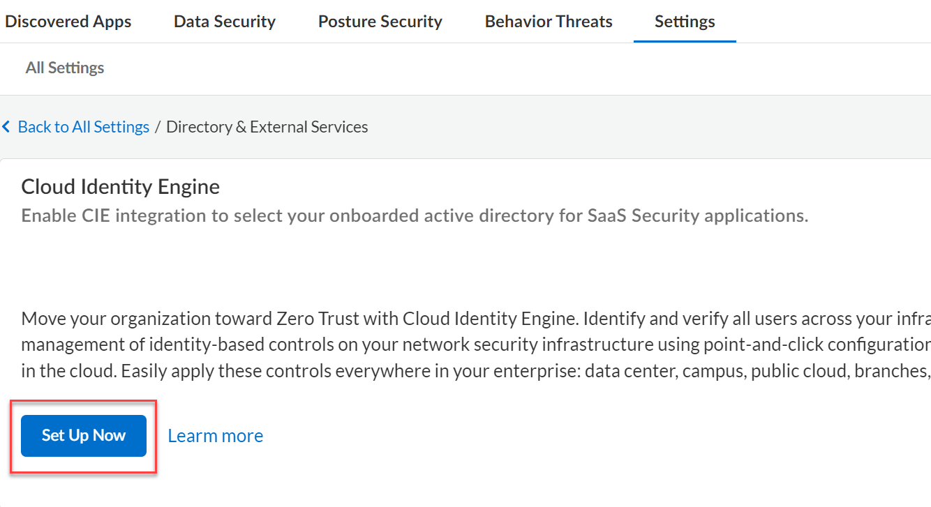 - Log in to Strata Cloud Manager.Select ConfigurationSaaS SecuritySettingsDirectory & External Services.The following Cloud Identity Engine integration pane is available only if you have not activated Cloud Identity Engine or connected your Cloud Identity Engine with your directory.On the Cloud Identity Engine integration pane, select Set Up Now.