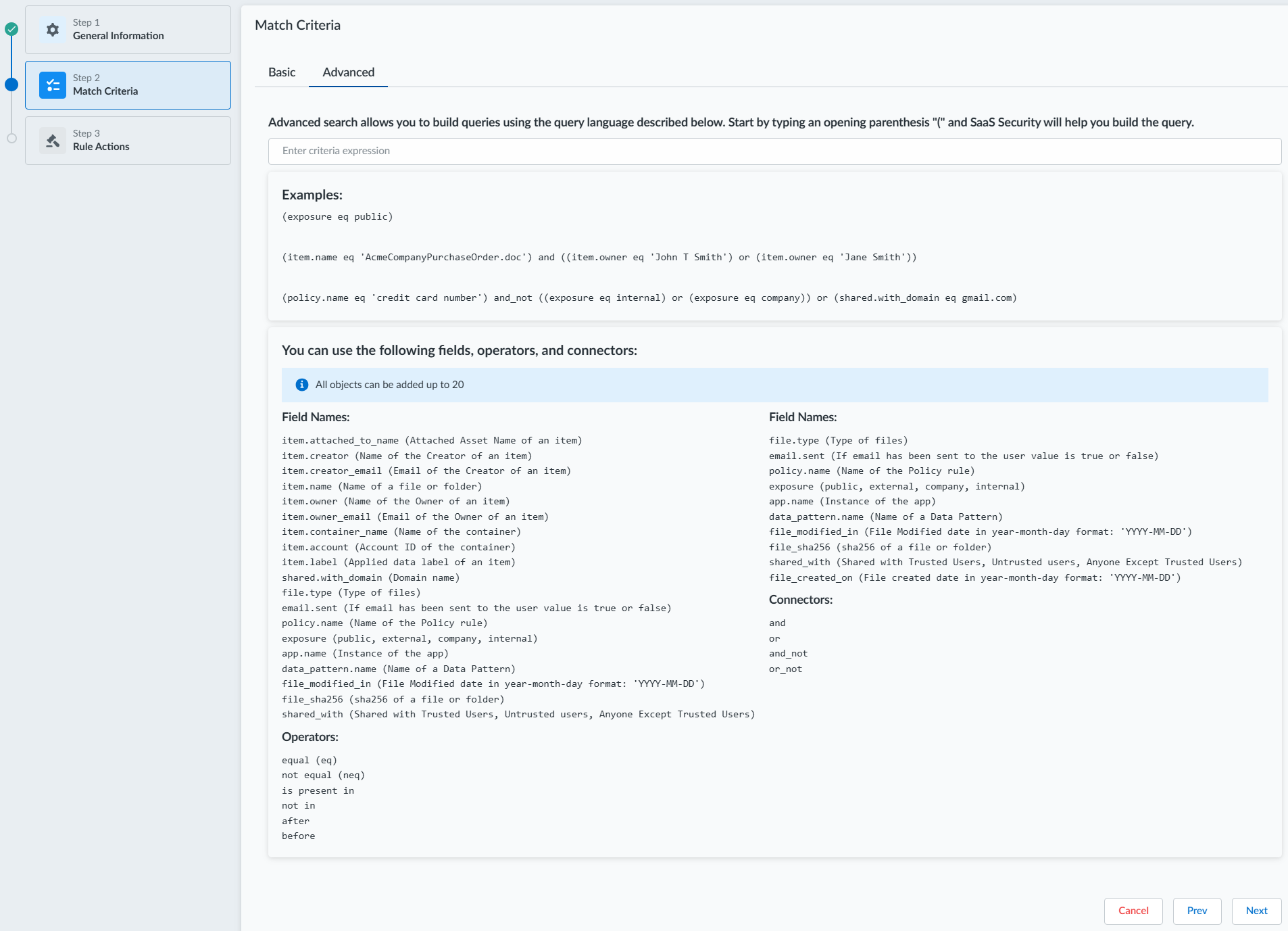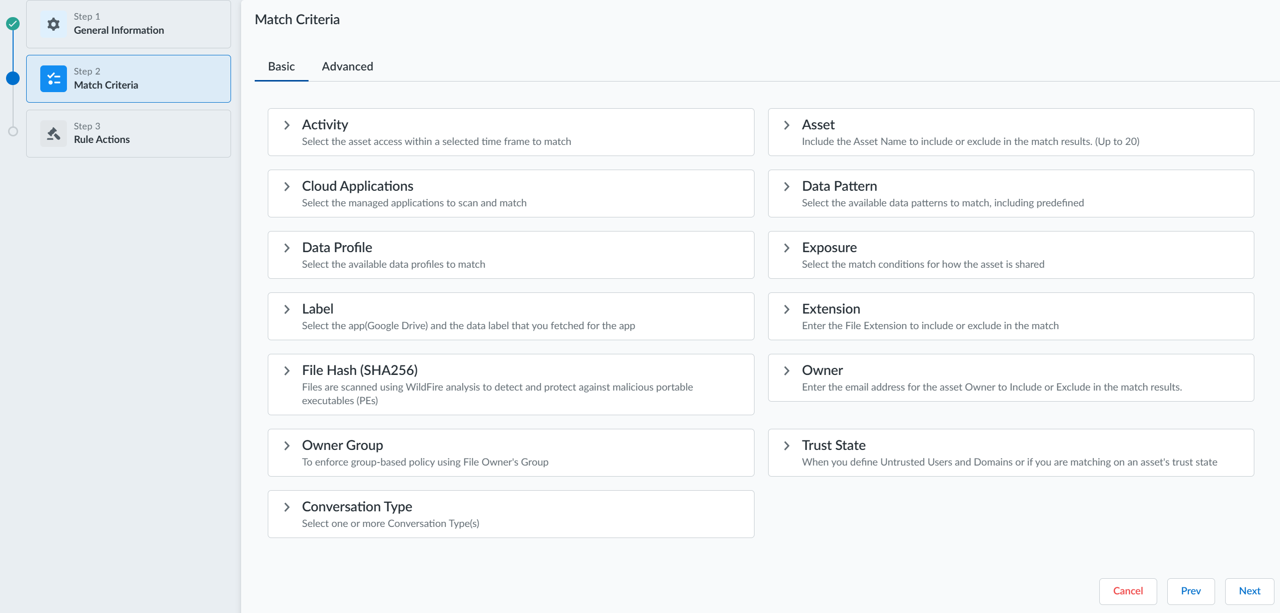 match criteria (for example: Activity, Asset, Data Pattern, Exposure, and